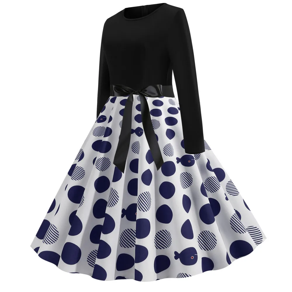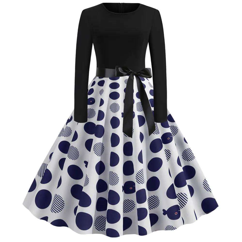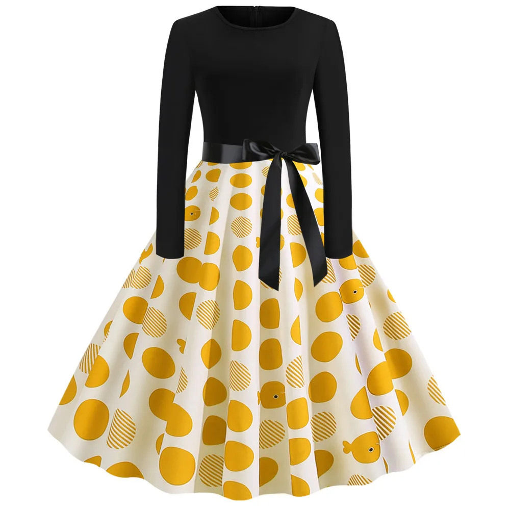 Женские винтажные Коктейльные ретро платья миди с длинным рукавом и круглым вырезом