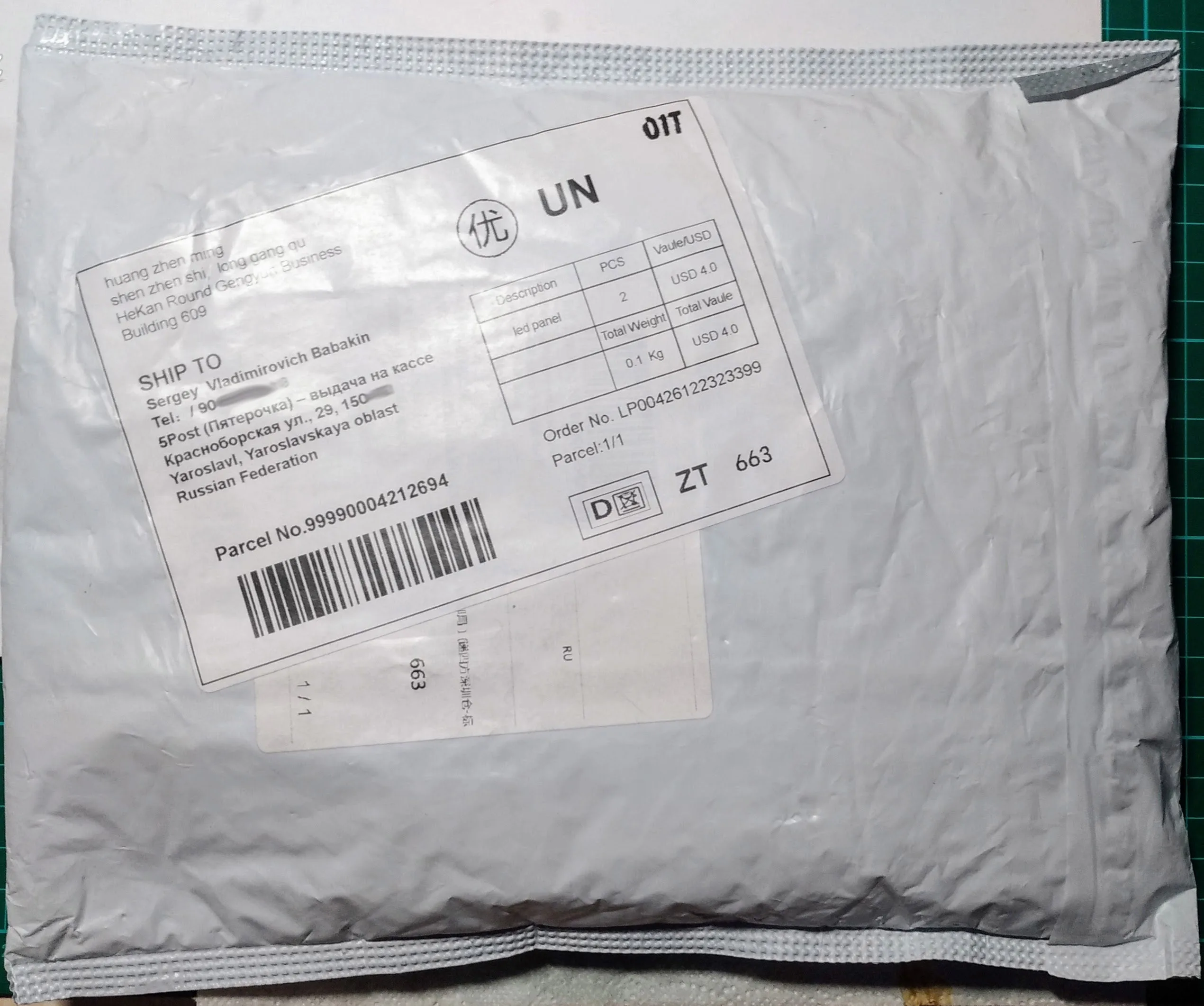 Пришло за 3 недели, что вполне нормально. Но вот с посылкой что делали в дороге - не ясно. Футбол играли что-ли. Запаковано хорошо, но это не спасло от вандальского отношения при перевозке. Я уж было загрустил что не будут работать пару диодов, но все обошлось. Матрицу аккуратно выровнял, все светодиоды светятся нормально.