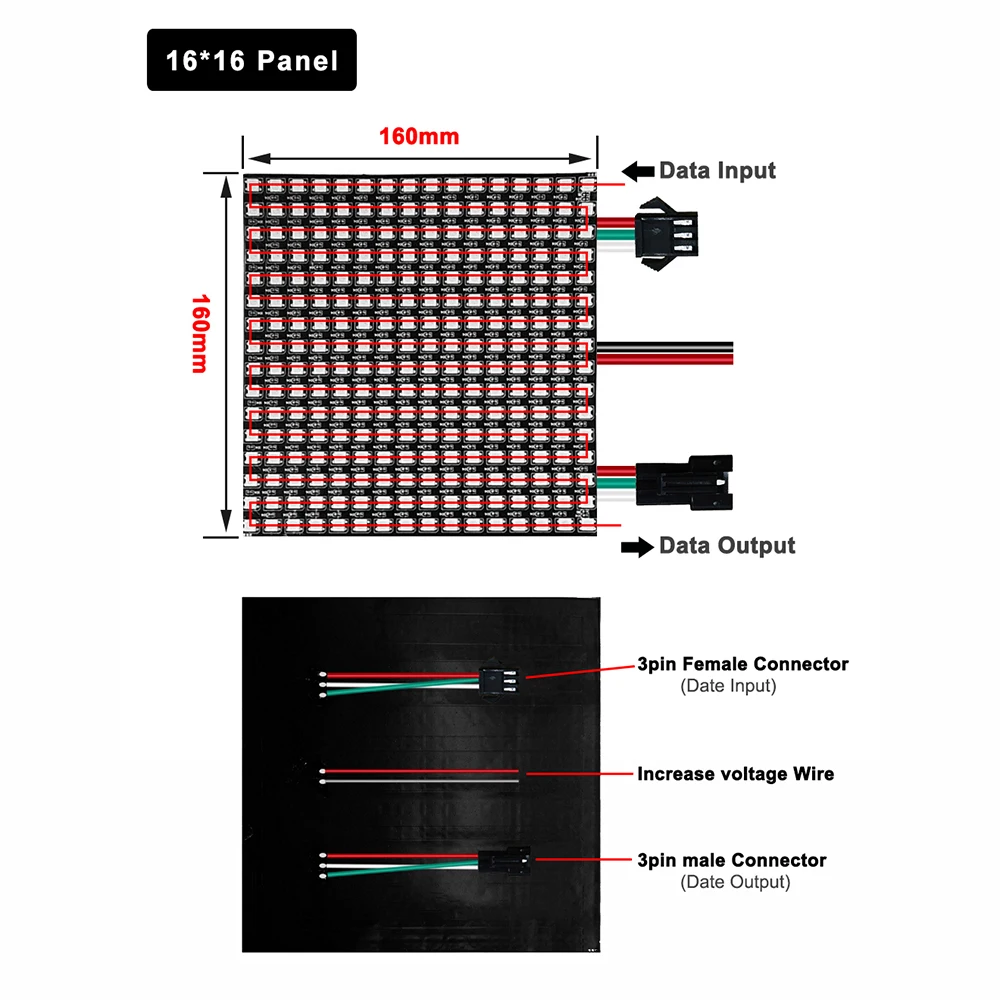 16x16 Светодиодная панель размером примерно 6 дюймов, точно так же, как на фото. Имеет соединения для легкого подключения одной панели к другой. С нетерпением ждем возможности сделать это! Прибыло раньше, чем ожидалось, отправлено в тот же день, как заказано. Отличный продавец!