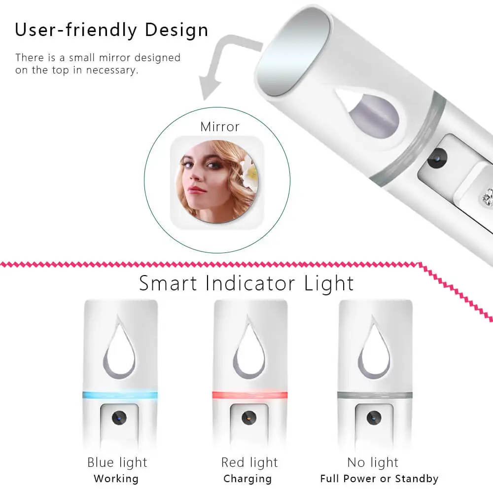 Функции: анализатор кожи, внешний аккумулятор, нано-спрей Материал: АБС-пластик Вес: 115 граммов Размер: 15*4,8*4,6 см Источник питания: перезаряжаемая батарея Емкость воды: 40 мл Емкость аккумулятора: 1500 мАч Номинальная мощность: 2 Вт Способ зарядки: USB Время зарядки: около 2 часов Время автоматического выключения: 2 минуты Инструкции по статусу: Рабочий (сияние светильник), Аккумулятор заряжается (красный светильник блеск), Полная зарядка (зеленый светильник) Посылка: простая коробка Аксессуары: USB-кабель x 1