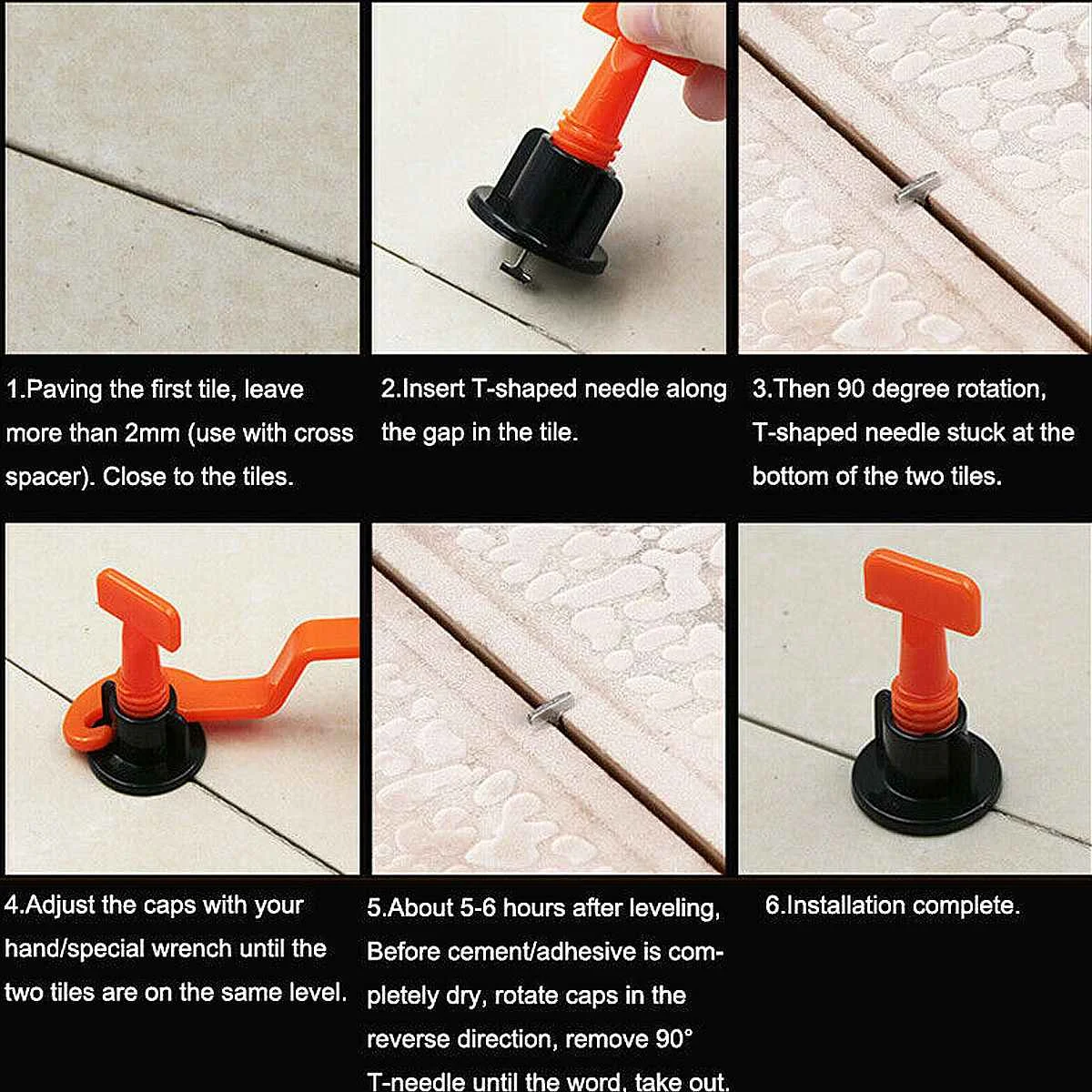 Особенности:● Износостойкий, многоразовый.●Прост в использовании для самостоятельной работы.● Держите равновесие плитки в одном и том же горизонтальном положении.● Улучшение скорости установки плитки.●Снижение усталости/стресса установщика.●Практически без липких пятен, плоская поверхность резко.●Уменьшает потребность в шлифовке и полировке.●Предотвращает движение плитки во время отверждения.Советы по использованию:1. Обмотка первой плитки, оставьте более 2 мм (Используйте с поперечной проставкой). Близко к плитке.2. Вставьте Т-образную иглу по промежутку в плитке.3. Затем вращение на 180 градусов, Т-образная игла застряла в нижней части двух плиток.4. Отрегулируйте колпачки рукой/специальным ключом до тех пор, пока две плитки не будут на одном уровне.5. Примерно через 5-6 часов после выравнивания, до полного высыхания цемента/клея поверните колпачки в обратном направлении, снимите 180 ° Т-иглу до слова, выньте.