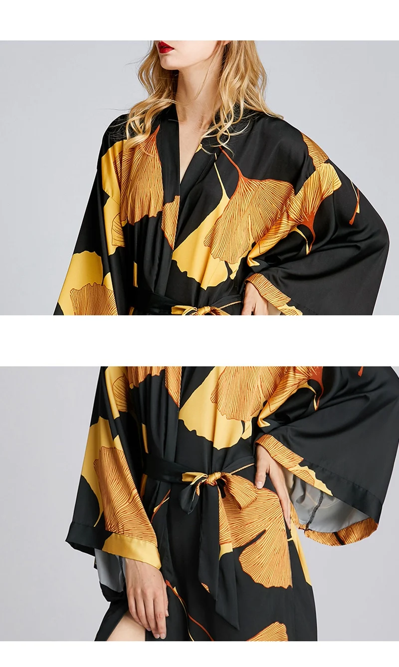Женские длинные платья черного цвета с рисунком гинкго Винтаж ночные рубашки для девочек Атласные Платья для подружек невесты размера плюс кимоно невесты халат, одежда для сна