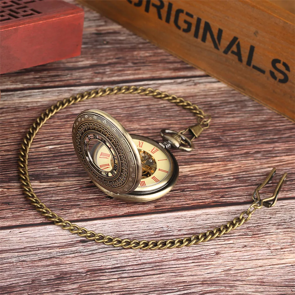 Часы наручные механические с полым циферблатом, изысканные карманные с бронзовым покрытием, с подвеской и римскими цифрами, подарок для мужчин