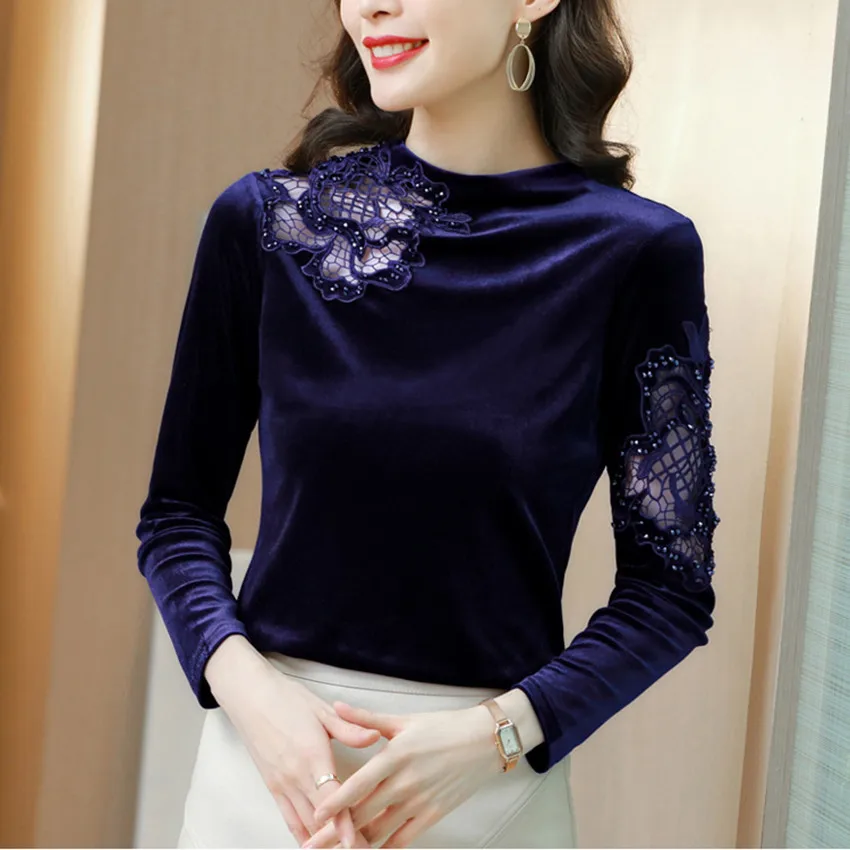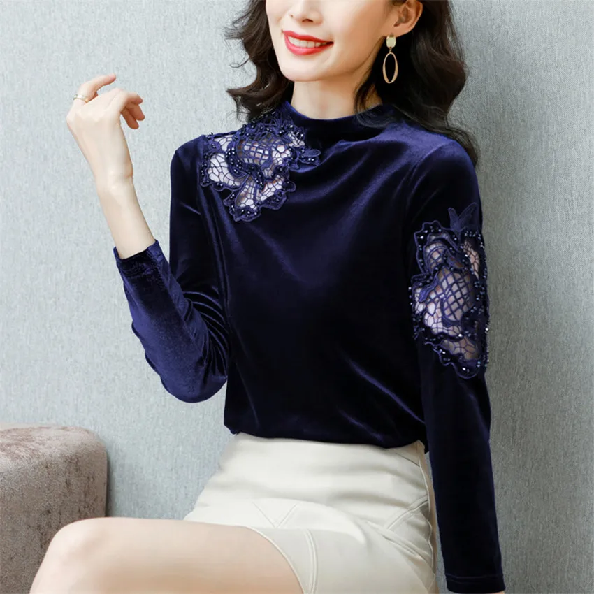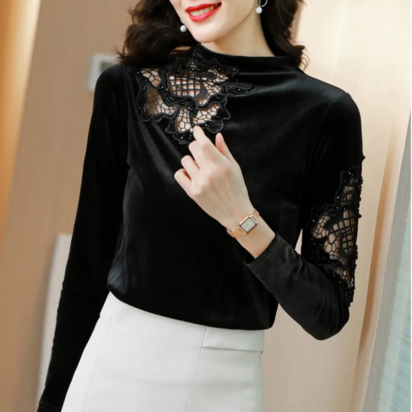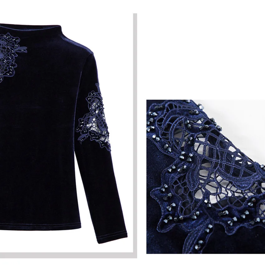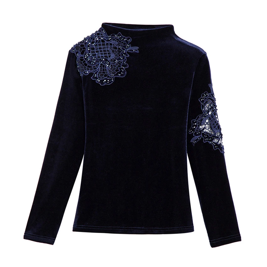 Женская бархатная футболка с длинным рукавом, с кружевом