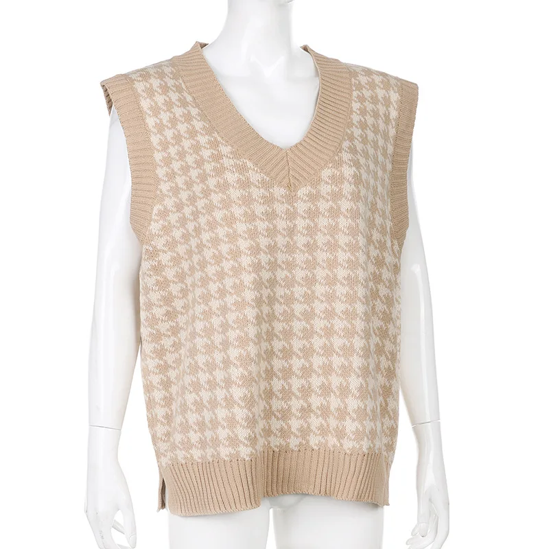 Женский вязаный Свитер оверсайз в ломаную клетку, вязаный пуловер в английском стиле без рукавов, свободный трикотажный пуловер с V-образным вырезом 90-х годов на осень