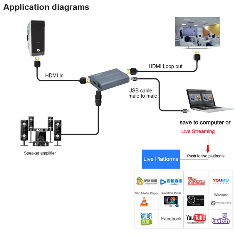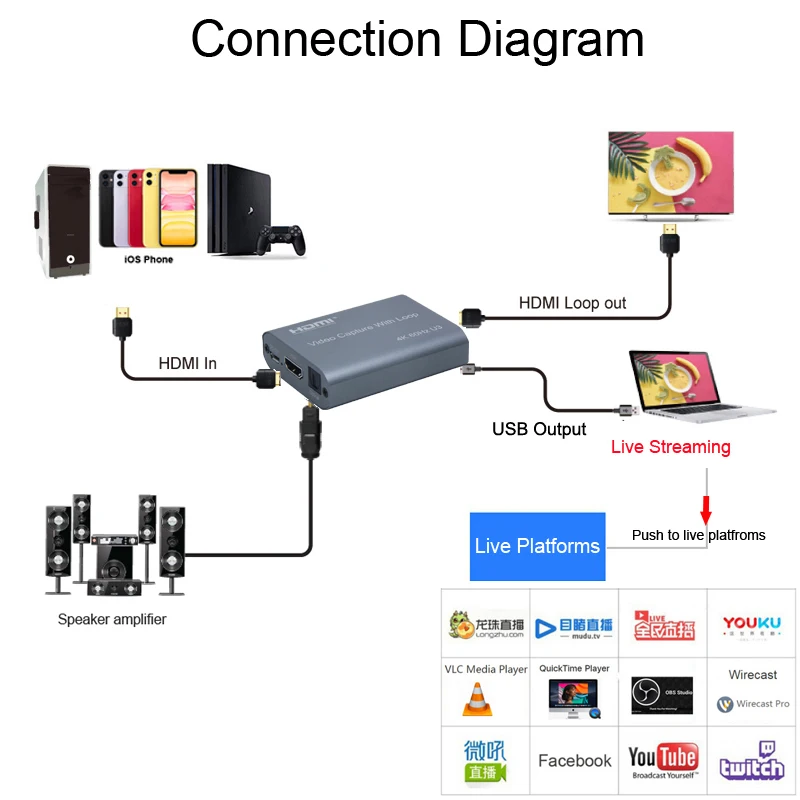 Подключение и эксплуатация1. Подключите источник сигнала UHD к HDMI-входу видеозахвата с помощью одного кабеля HDMI;2. Подключите устройство отображения к выходу HDMI видеозахвата с помощью одного кабеля HDMI;3. Подключите USB-порт ПК к USB-выходу видеозахвата с помощью одного кабеля USB 3,0;4. Подключите адаптер питания 5 В/1 А к видеозахвату;5. Шаги по снятию видео через USB (OBS): ADd новые источники, выберите «устройство видеозахвата»/«захват аудиовхода» →установите размер изображения →выберите «студийный режим