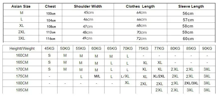 Если вы не уверены, пожалуйста, сообщите мне ваш рост и вес?Размер M подходит для веса 50-60 кгРазмер L подходит для веса 60-68 кгРазмер XL подходит для веса 65-72 кгРазмер XXL подходит для веса 72-80 кгРазмер XXXL подходит для веса 80-90 кгПримечание:1. Мы продаем Азиатские размеры. Примерно на 2-3 размера меньше, чем размер США, Великобритании, России, ЕС.2. Как измеряется вручную; Погрешности могут составлять 1-3 см разницу допускается (1 см = 0,39 дюйма)