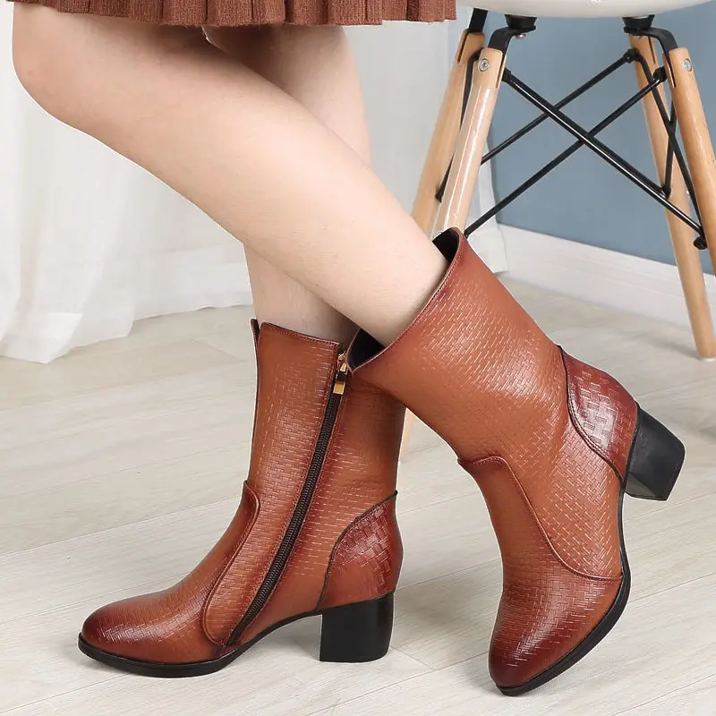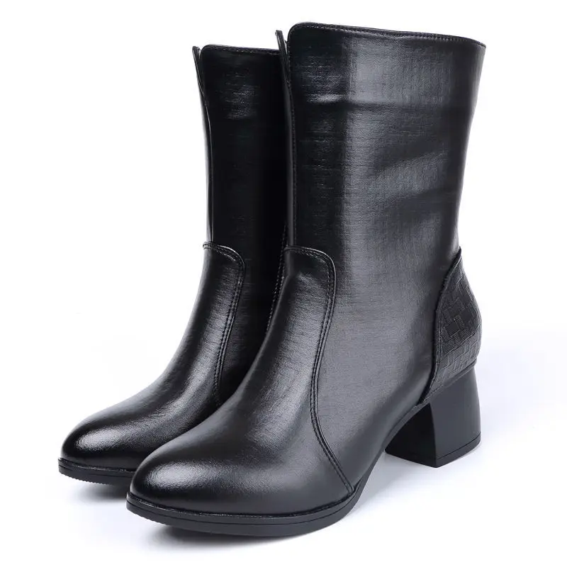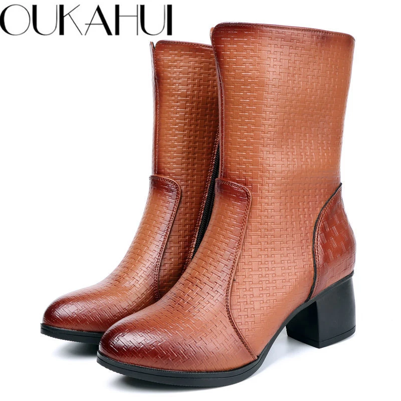 Женские сапоги до середины икры OUKAHUI, осенние элегантные винтажные сапоги из натуральной кожи, с круглым носком, на толстом каблуке, на молнии, зимние теплые, 2020