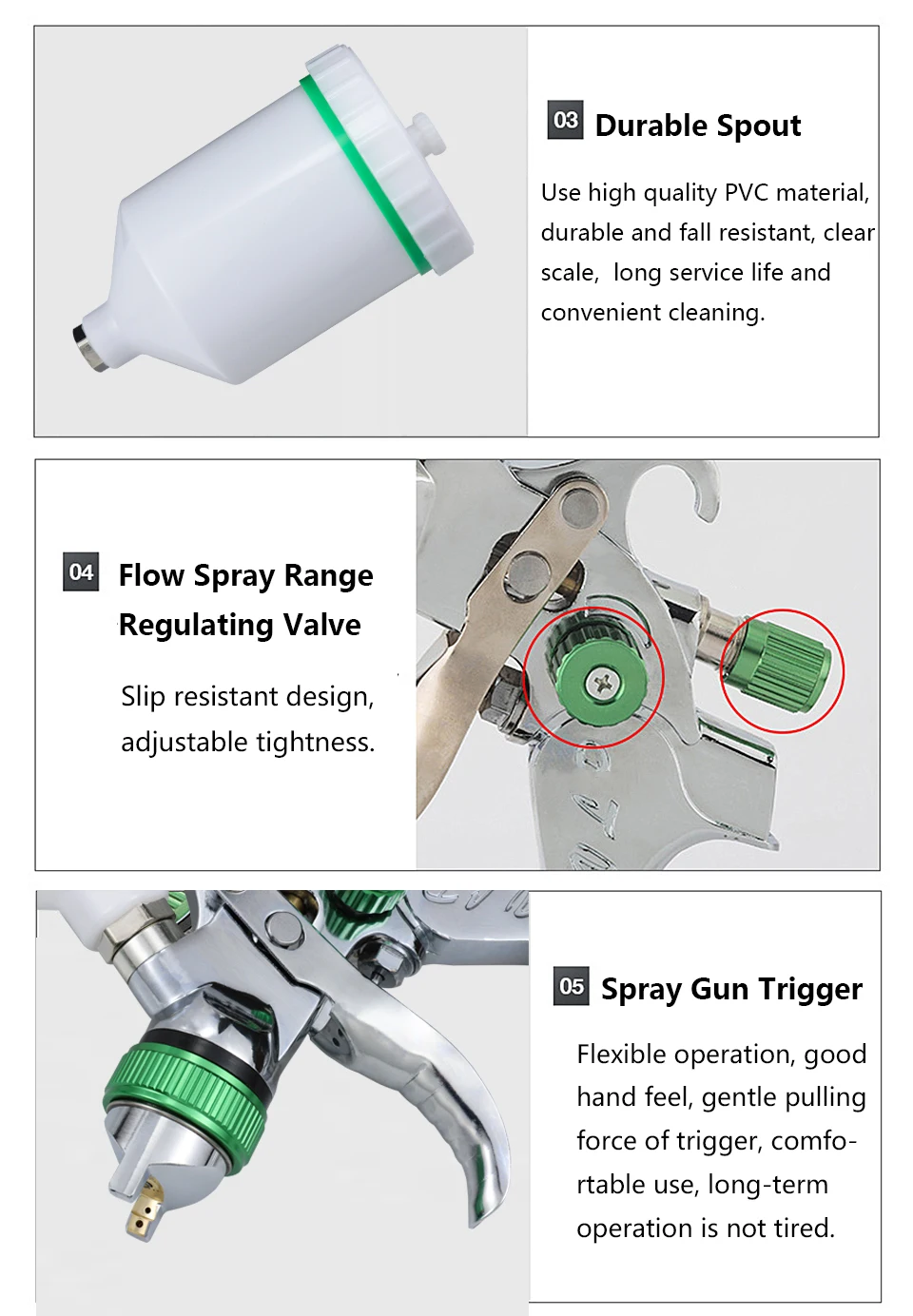 1. Все медные крышки потокаВсе медные крышки потока, металлический сердечник клапана, износостойкие и коррозионно-стойкие, дизайн 15 отверстий, тонкая распыление.2. Детали наконечника иглыПосле специальной обработки, функция уплотнения хорошая, и срок службы длинный.3. Прочный аэрозоль можетИспользуйте Высококачественный ПВХ-материал, прочный и устойчивый к падению, с ясным масштабом, долгим сроком службы и удобной чисткой. 600cc ПВХ чашка позволяет просматривать уровень жидкости краски.4. Клапан регулирования диапазона потокаНескользящая конструкция, регулируемая герметичностьКлапан регулирования потока (Ослабление: больше краски на выходе, затяжка: меньше краски на выходе)Клапан регулирования диапазона распыления (Ослабление: большой диапазон распыленияЗатяжка: малый диапазон распыления)