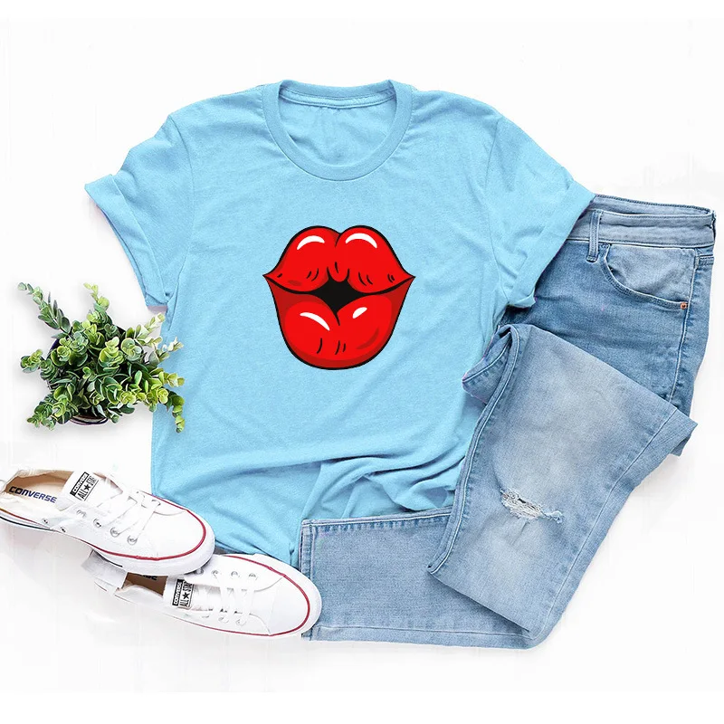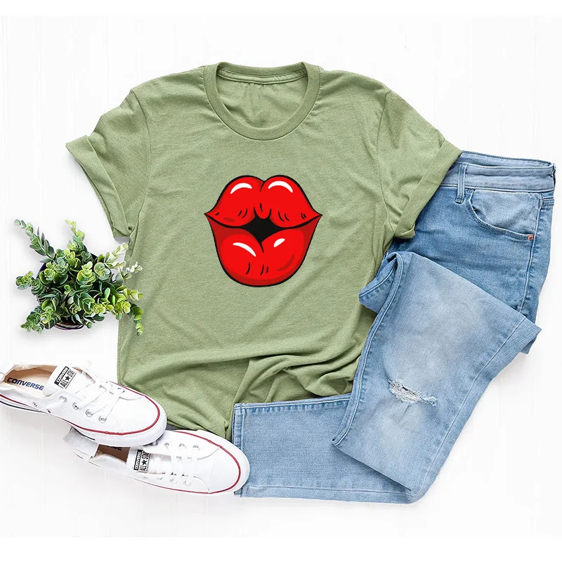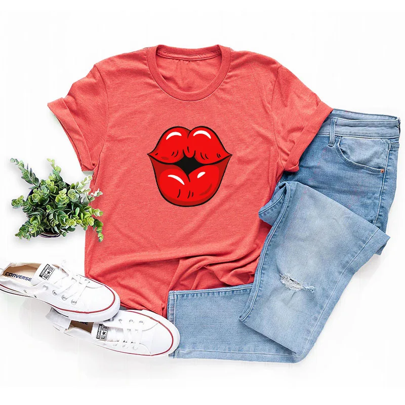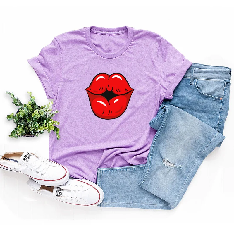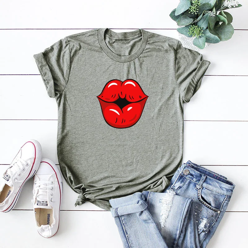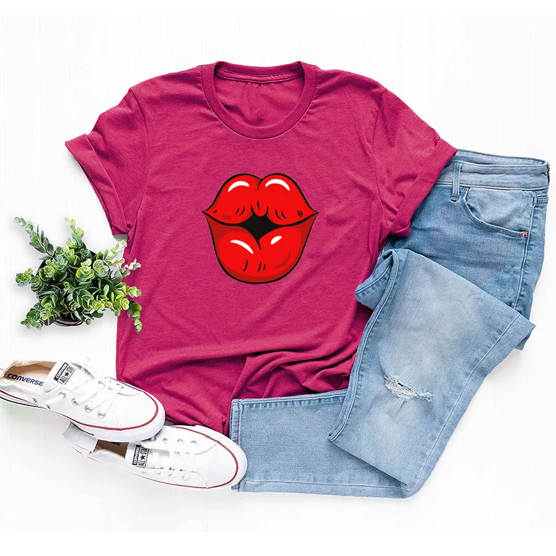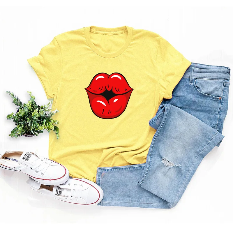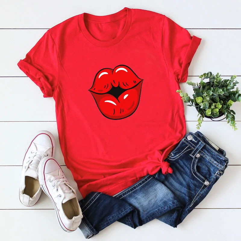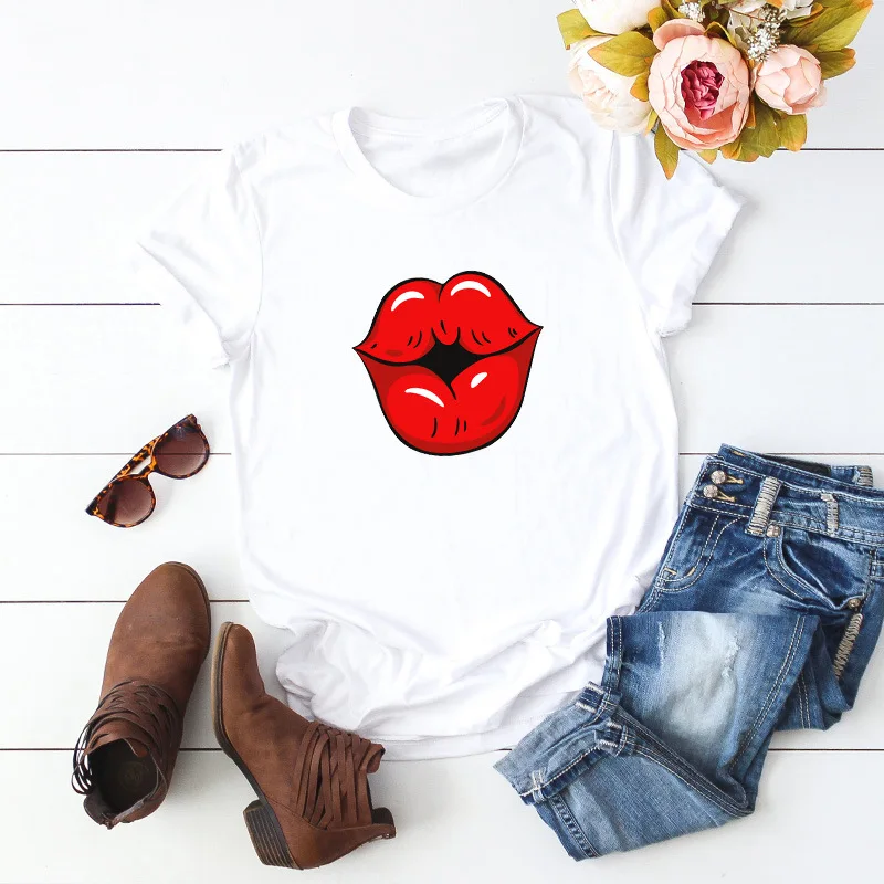 Летняя футболка для девочек размера плюс с О-образным вырезом с коротким рукавом; Футболки из хлопка пикантные женские туфли с рисунком в виде губ, с рисунком, модная, на каждый день, с рисунком, топы