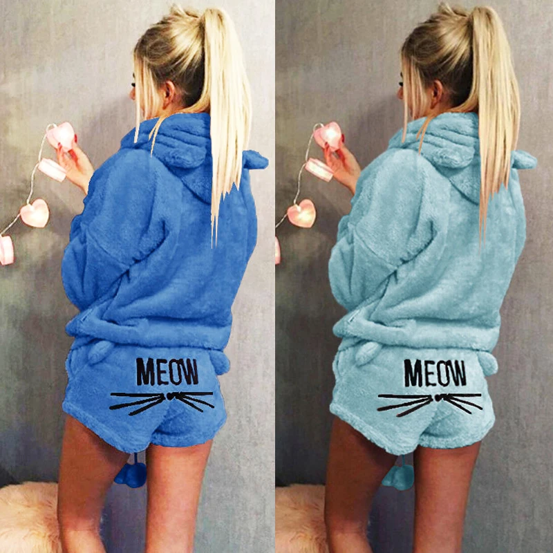 Модный женский зимний теплый Пижамный костюм, Женская плюшевая толстовка с капюшоном, топы с длинными рукавами и шорты с милым рисунком кота, 2020