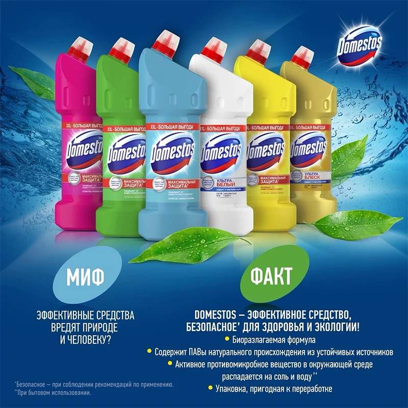 Продукция Domestos представлена только в растущих сегментах рынка чистящих средств: в чистящих гелях, туалетных блоках, универсальных спреях, средств для удаления засоров и известкового налета, чистящих салфетках, и сейчас находится на гребне волны потребительского спроса.На данный момент в ассортимент Доместос входит более 35 товаров для поддержания гигиены унитаза: среди которых универсальные гели, туалетные блоки, стикеры чистоты, чистящие салфетки.