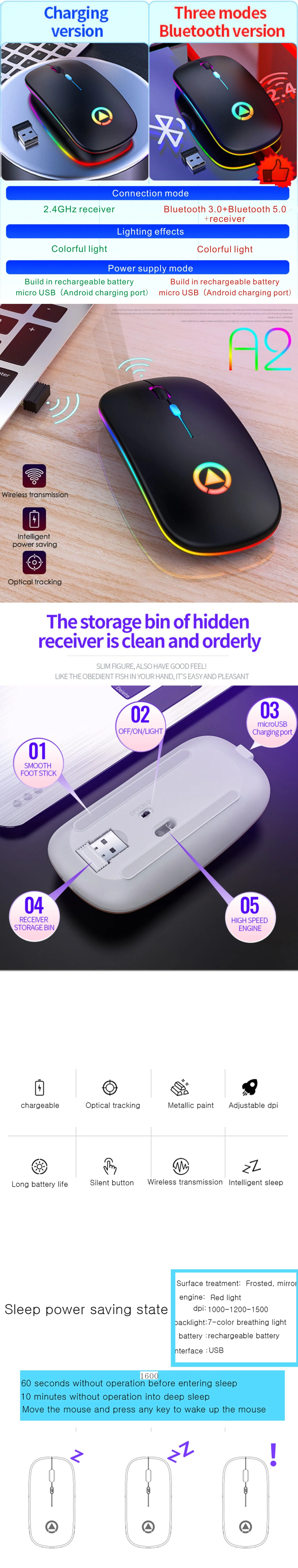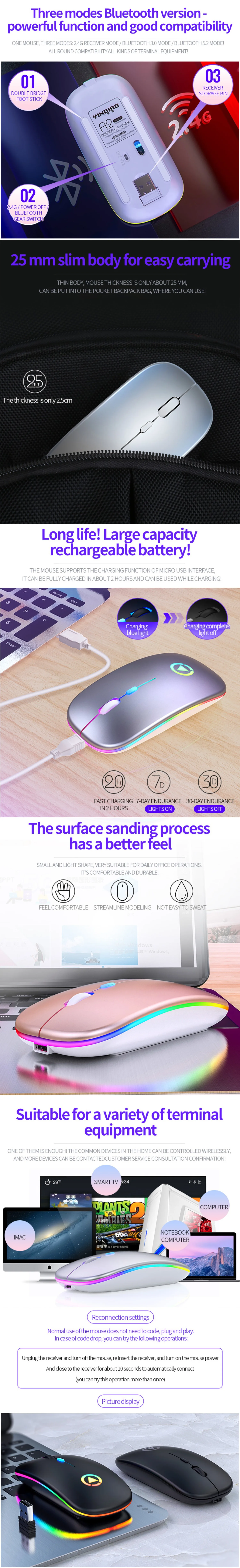 Мышь компьютерная беспроводная со светодиодной RGB подсветкой, бесшумная мышь с поддержкой Bluetooth, с двойным режимом работы, подходит для компьютерных игр и ноутбуков