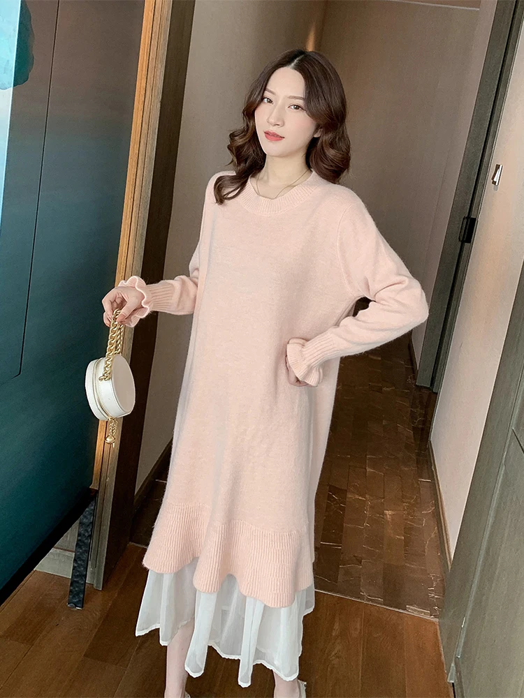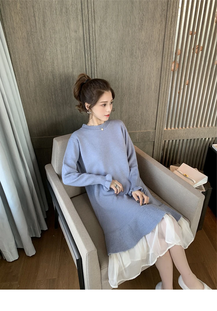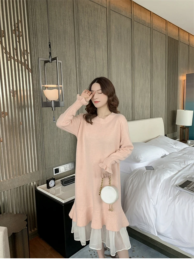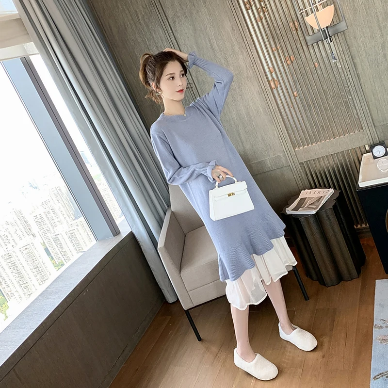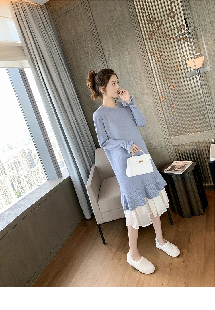 Длинное свободное вязаное платье с длинными рукавами и круглым вырезом для беременных женщин шифоновое платье-Русалка с оборками на подоле для беременных в стиле пэчворк