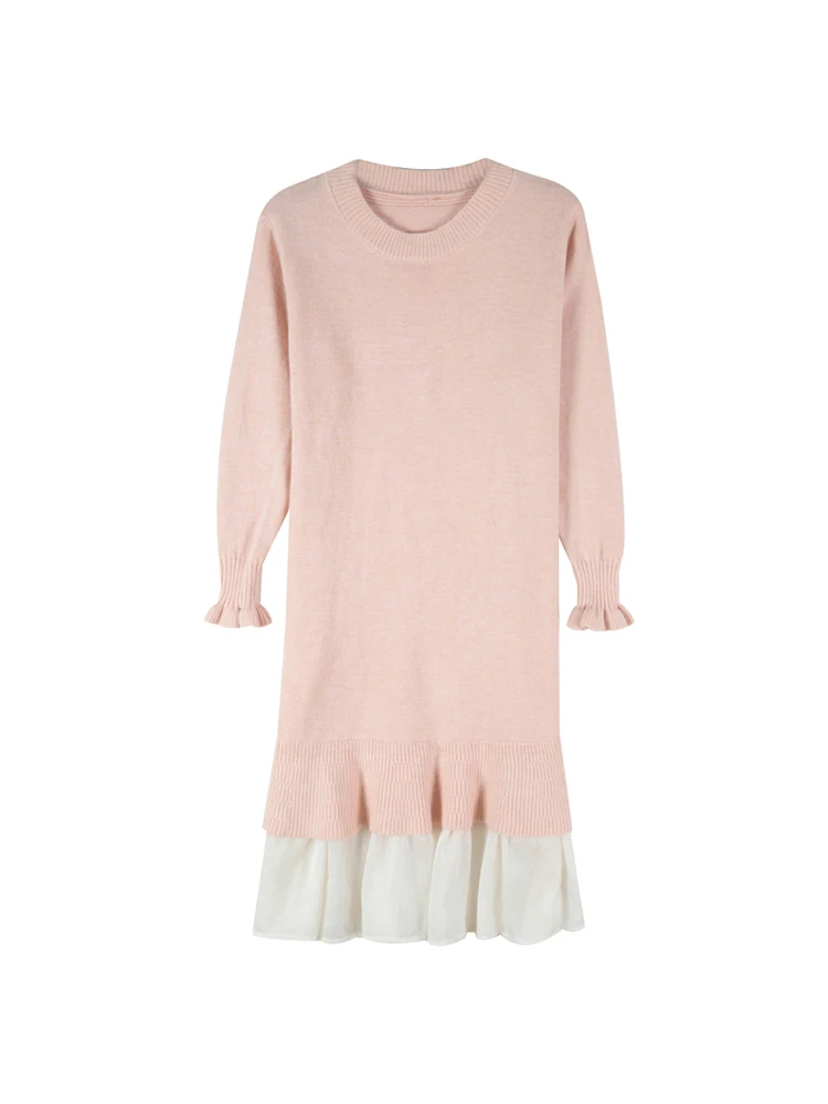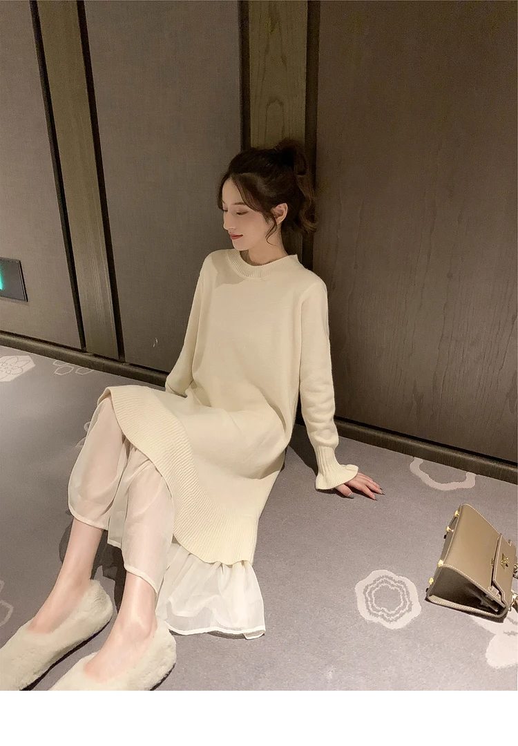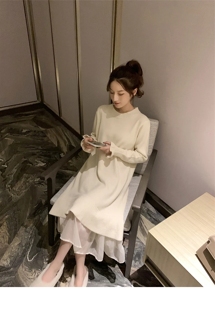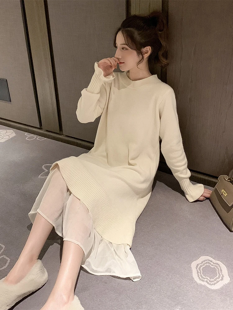 Длинное свободное вязаное платье с длинными рукавами и круглым вырезом для беременных женщин шифоновое платье-Русалка с оборками на подоле для беременных в стиле пэчворк