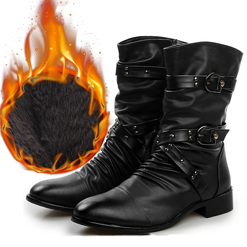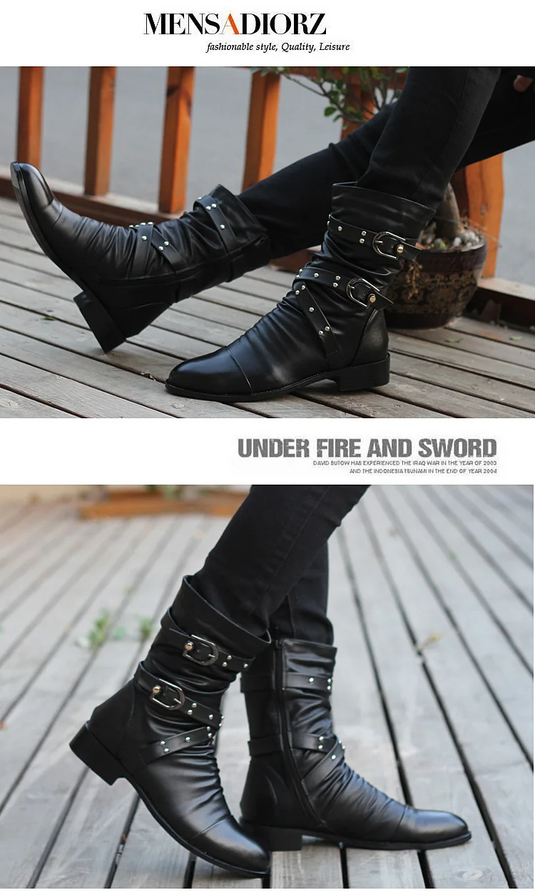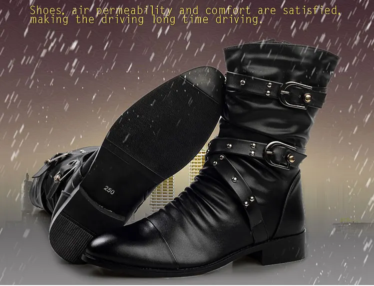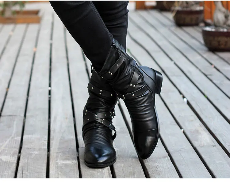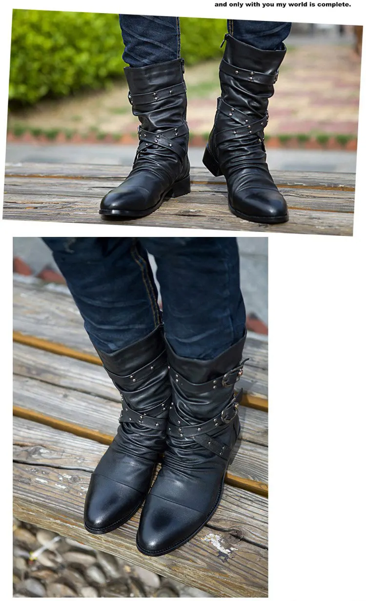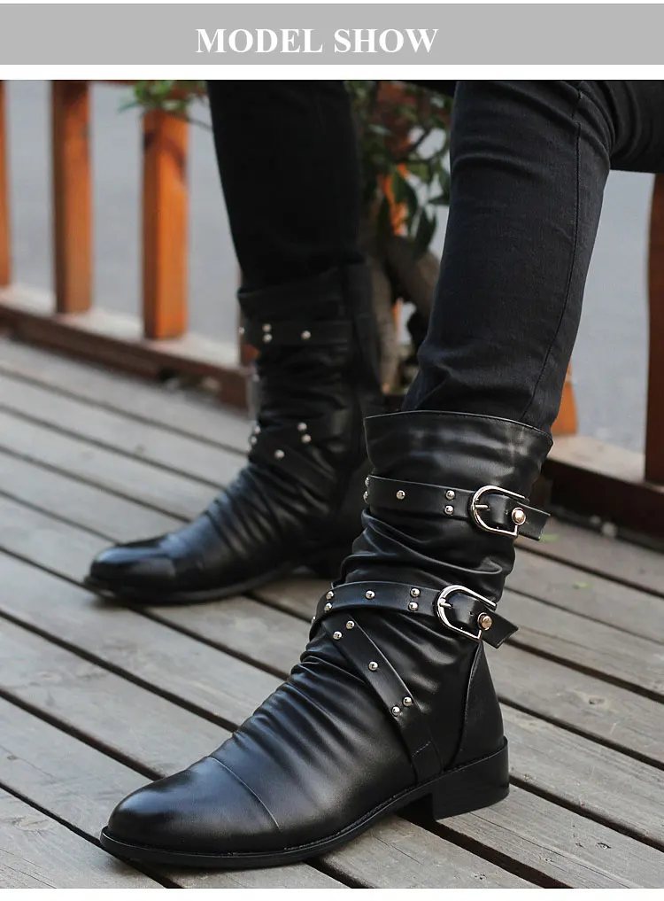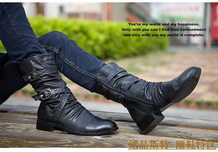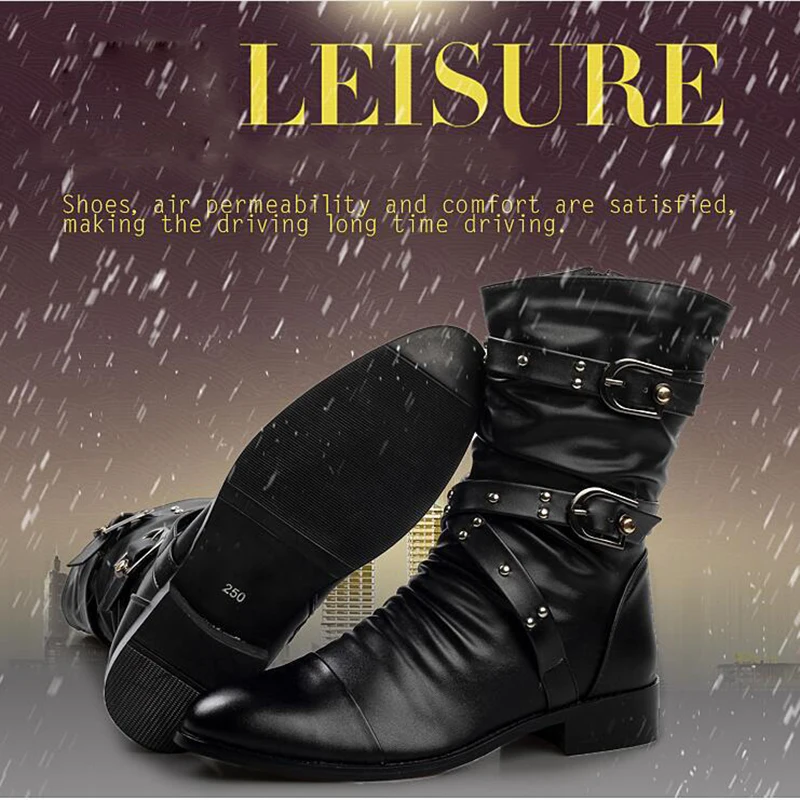 2020 Новые мужские ботинки; Сезон осень-зима; Модные панк-сапоги для езды на мотоцикле до середины икры с заклепками в британском стиле; Мужские Ботинки Martin с острым носком