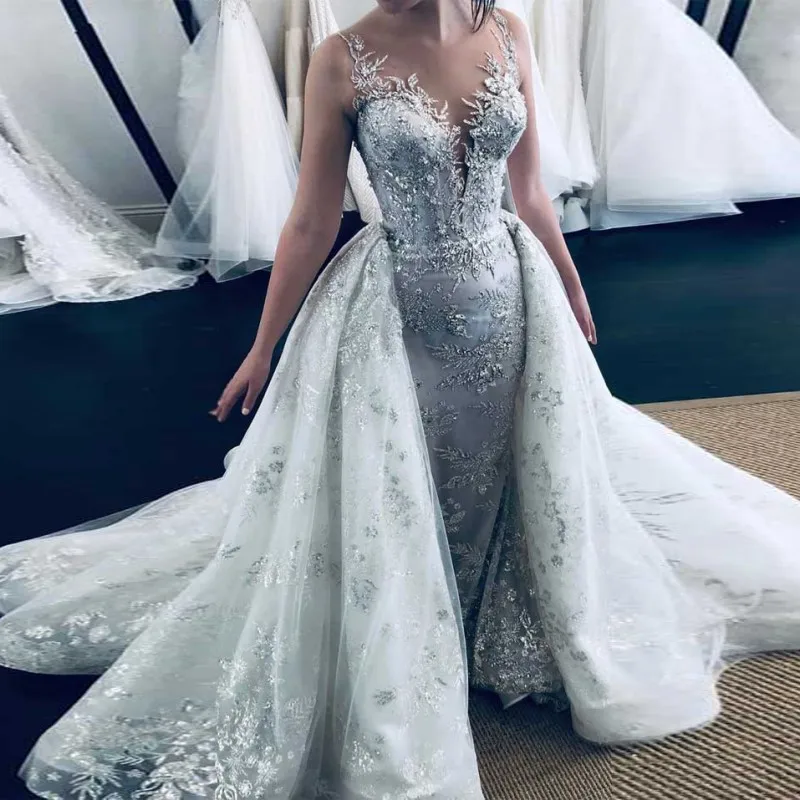 Серебристо-серое кружевное арабское свадебное платье Дубай с длинны...