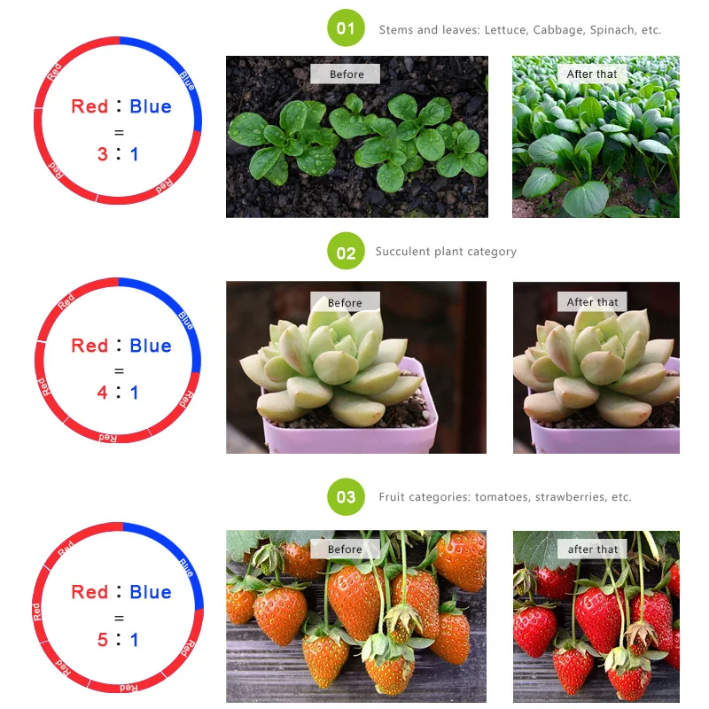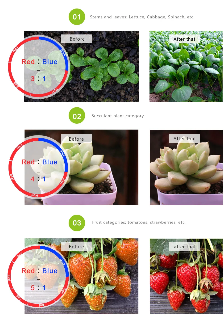 Скорость поглощения 750нм ~ 1000нм, стимулирует удлинение клеток, воздействие цветения и прорастания семян