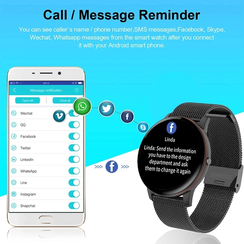 * Напоминание о звонках и сообщения push (SMS/QQ/Wechat/Skype/Facebook/Twitter/Line/WhatsApp)