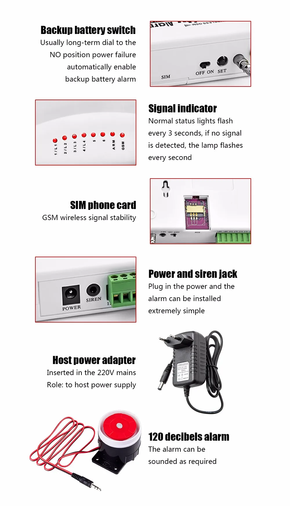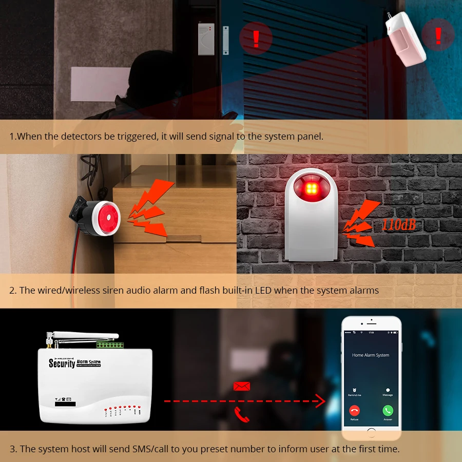 (4) при тревоге он автоматически уведомляет пользователей через мобильную сеть о возможном взломе с помощью либоГолосовые вызовы или SMS-сообщения