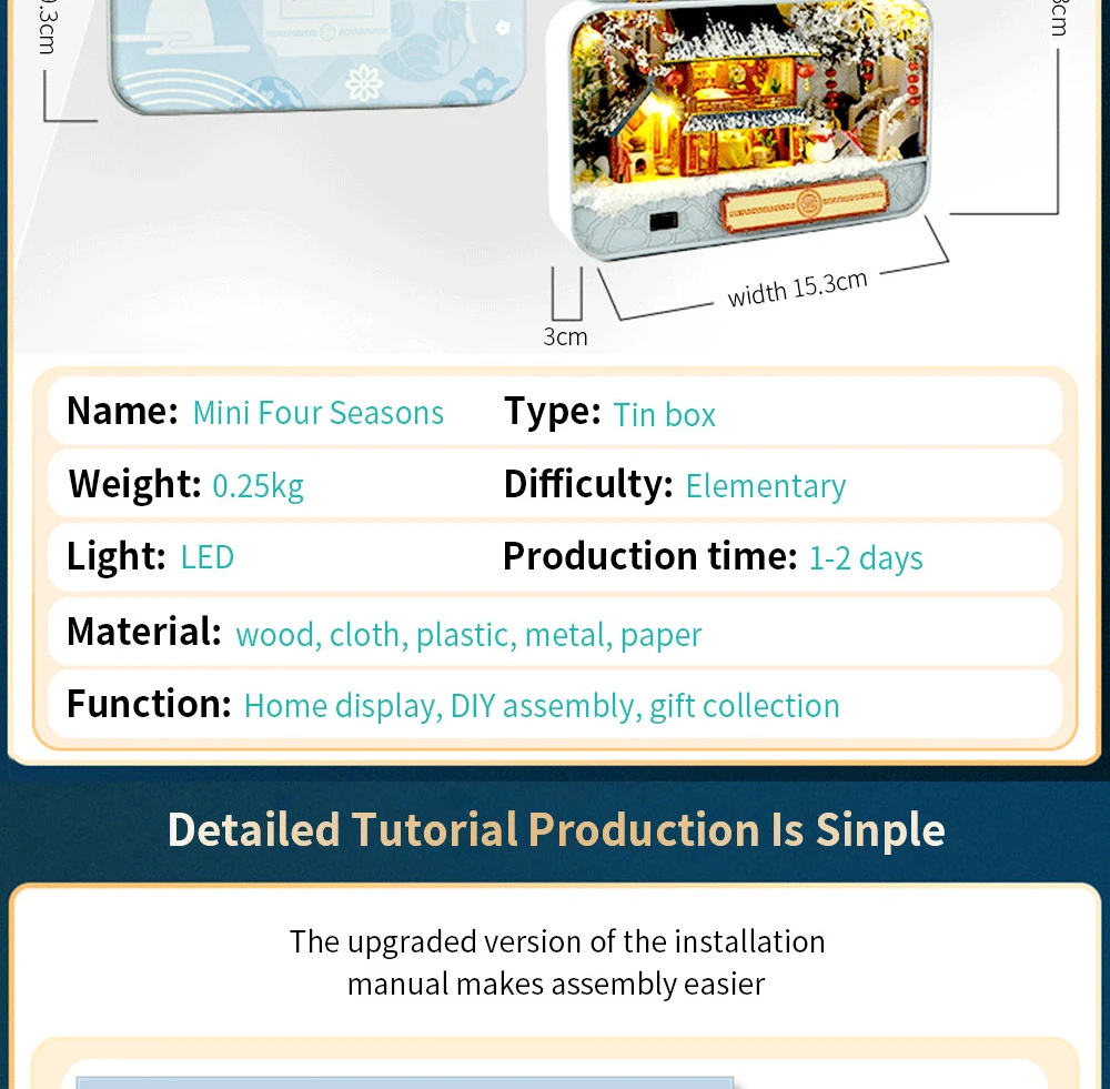 Четыре сезона Кукольный дом деревянные игрушки ручной работы все продукты такие же, как на изображении. Они поставляются с деталями, и их нужно собрать самостоятельно.1. Включая всю выставленную мебель2. Стиль: театральная коробка3. Размер: 15,3*3*16,4 см4. Материал: дерево, ткань, бумага, смола, пластик, жестяная коробка5. Руководство: с инструкциями6. Артикул имеет детали и нуждается в сборкеПримечание:1. При международной транспортировке запрещены батарейки, спирт, краска и клей. Если товар, который вы приобрели, содержит эти товары, мы должны их вынуть. Спасибо за понимание и поддержку.2. Возраст: подходит для детей старше 8 лет3. Дети до 3 лет должны сопровождаться взрослым4. Если вам нравится этот товар, пожалуйста, добавьте его в «список желаний». Если Вам понравился наш магазин, пожалуйста, добавьте его в «Список магазинов».