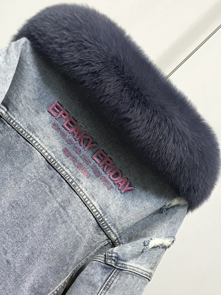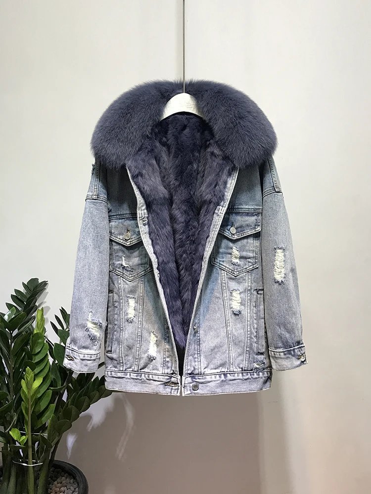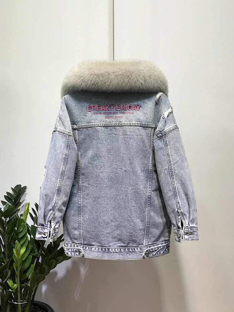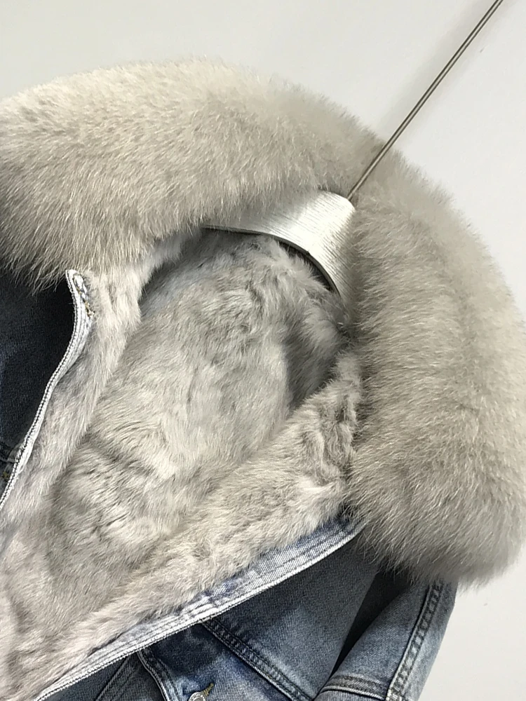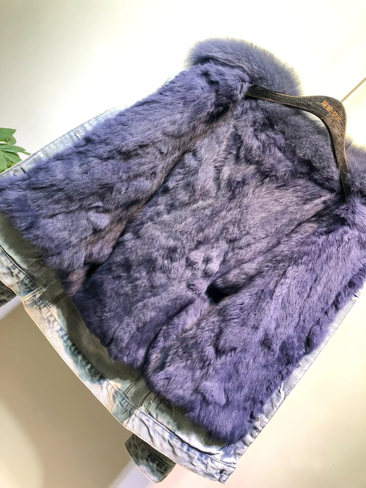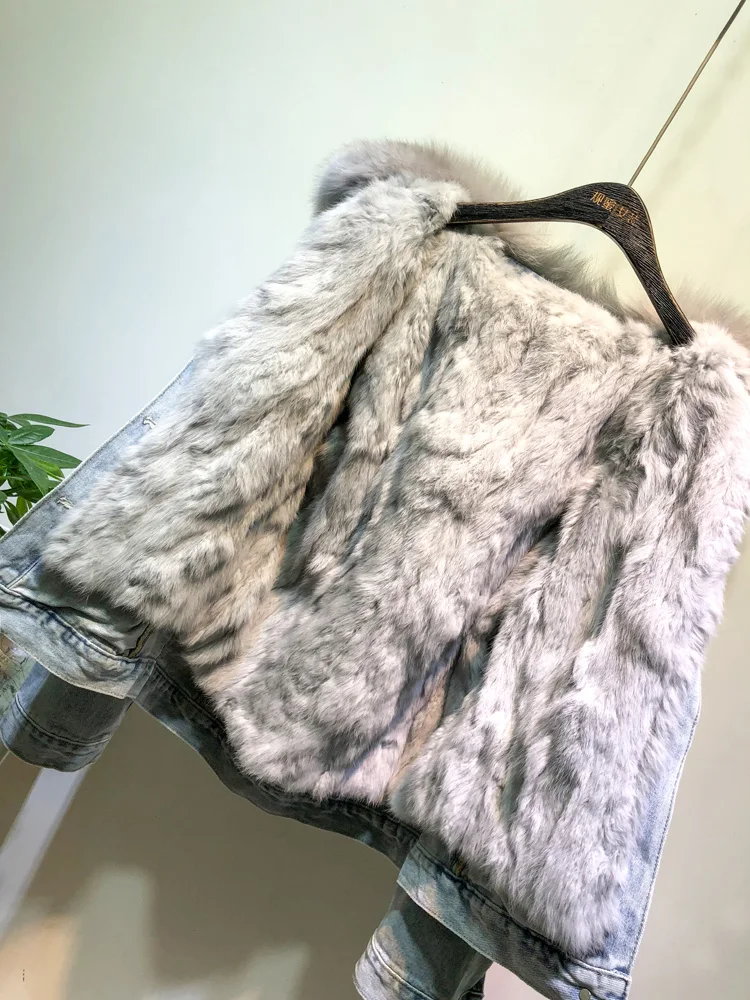 Женская джинсовая куртка, теплая зимняя куртка из натурального меха лисы и джинсовая подкладка из натурального кроличьего меха с вышивкой из перьев, F2465