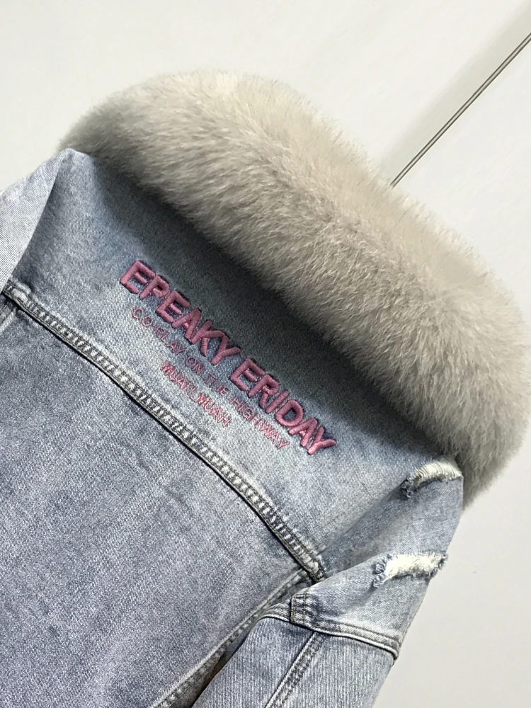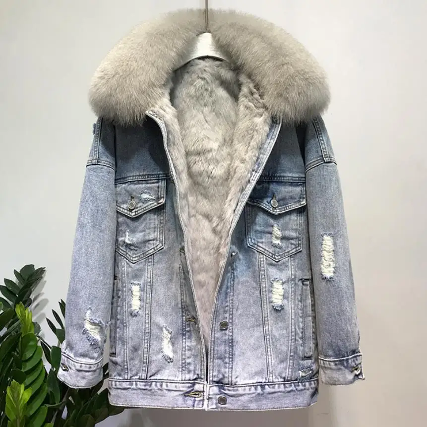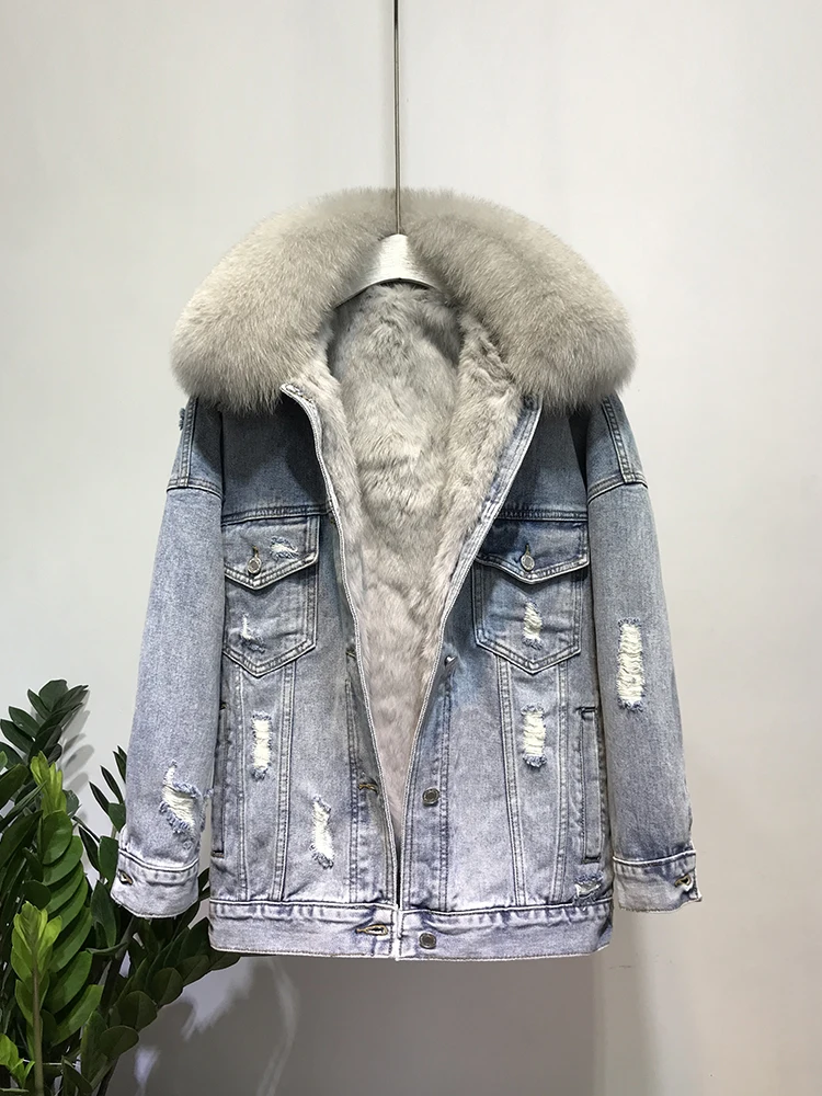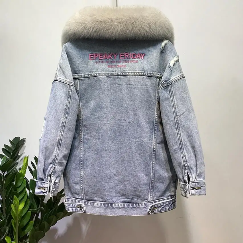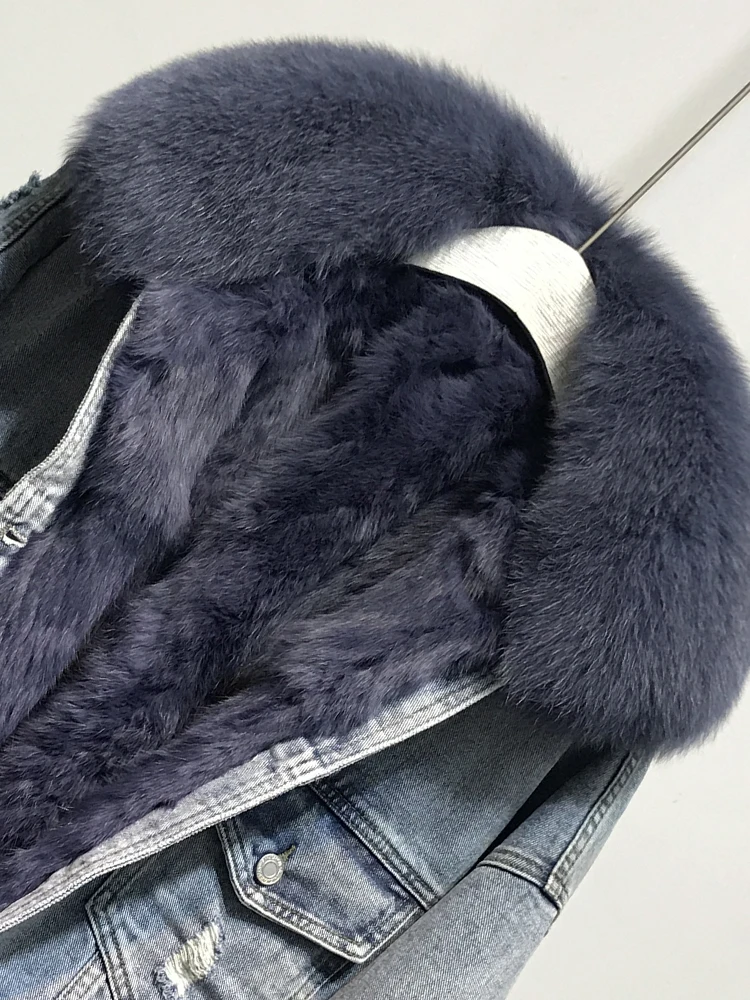 Женская джинсовая куртка, теплая зимняя куртка из натурального меха лисы и джинсовая подкладка из натурального кроличьего меха с вышивкой из перьев, F2465