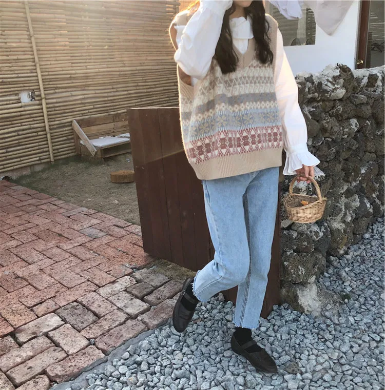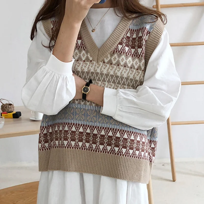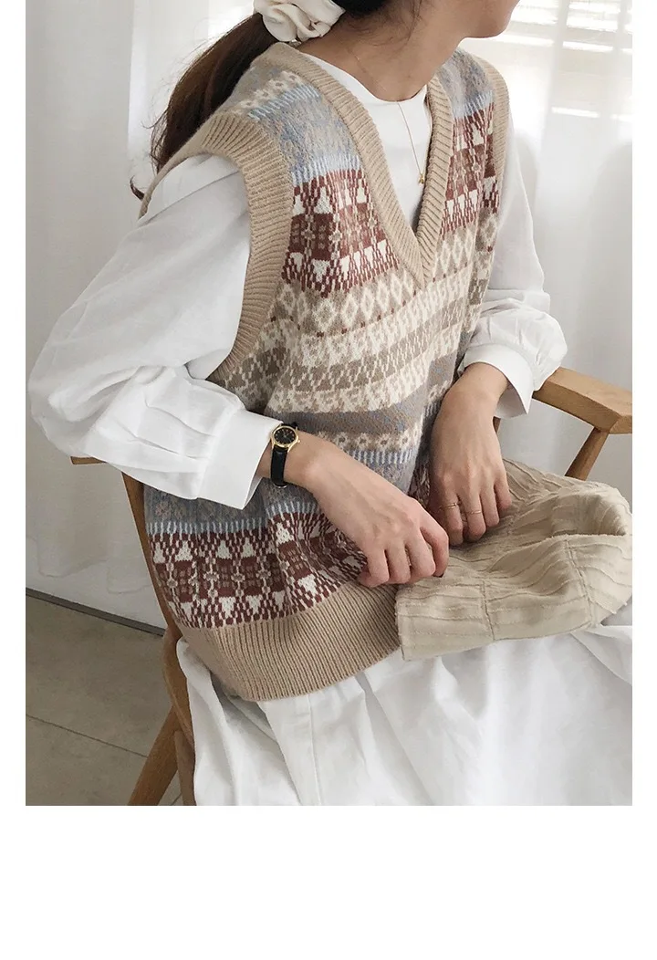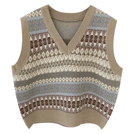Женский винтажный свитер-жилет с принтом и V-образным вырезом