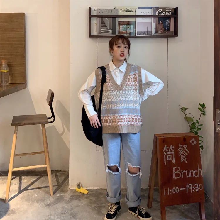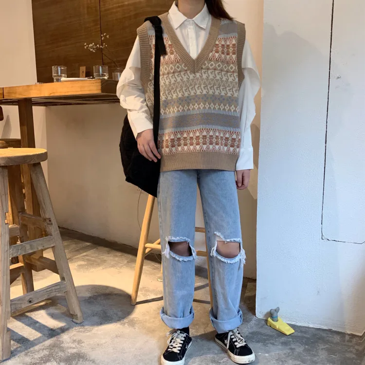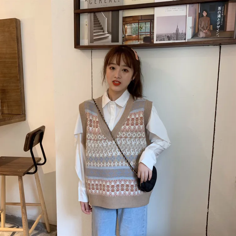 Женский вязаный жилет, пуловер без рукавов, свободный, с V-образным вырезом, в винтажном стиле, 2021