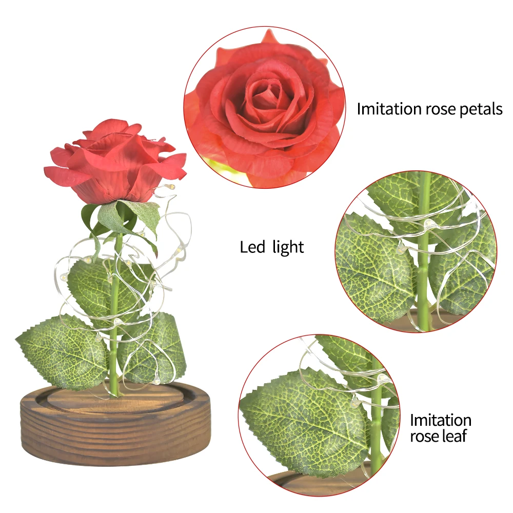 Прямая поставка, красныйбелыйчерный вечный цветок розы в стеклянном куполе со светодиодной подсветкой, деревянная основа, рождественские подарки ко дню Святого Валентина для женщин