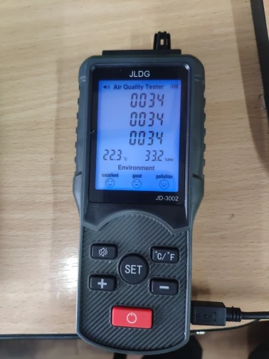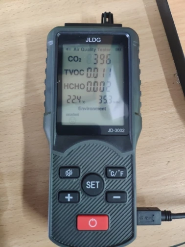 Прибор работает, в комплекте удобный чемодан для хранения. Измеряет три параметра: диоксид углерода, общее количество летучих органических соединений и наличие паров формальдегида. Помимо этого, измеряет температуру и относительную влажность воздуха.