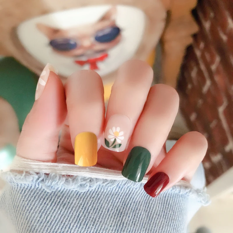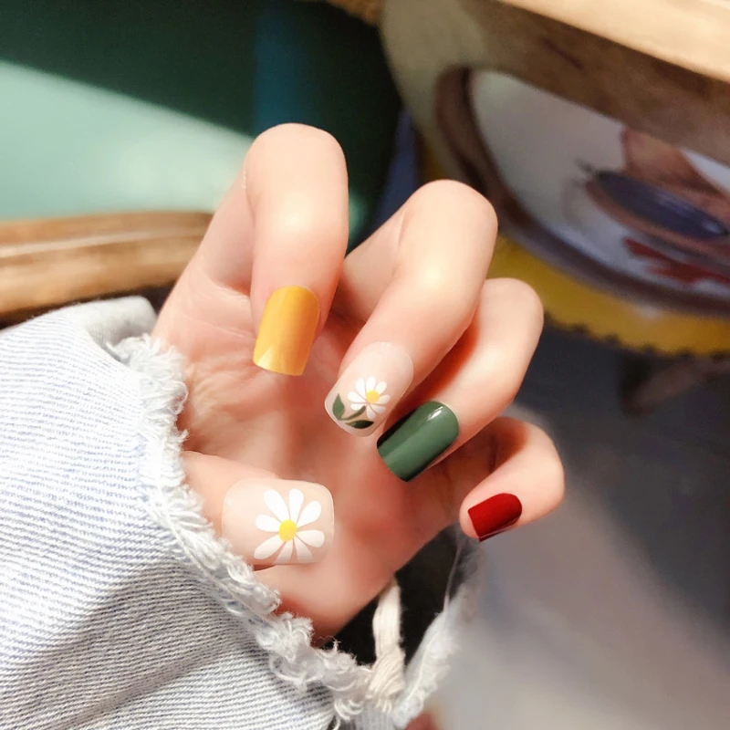 24 шт., цветок маргаритки, накладные ногти, милые патчи для дизайна ногтей, модные стильные короткие накладные наклейки для ногтей, гидрогелевые накладные ногти