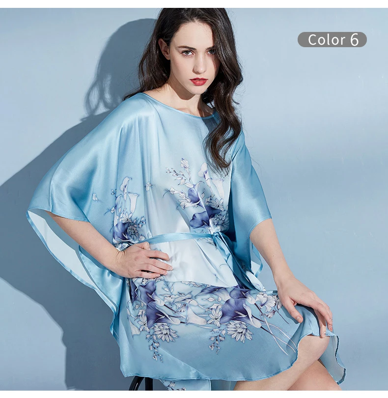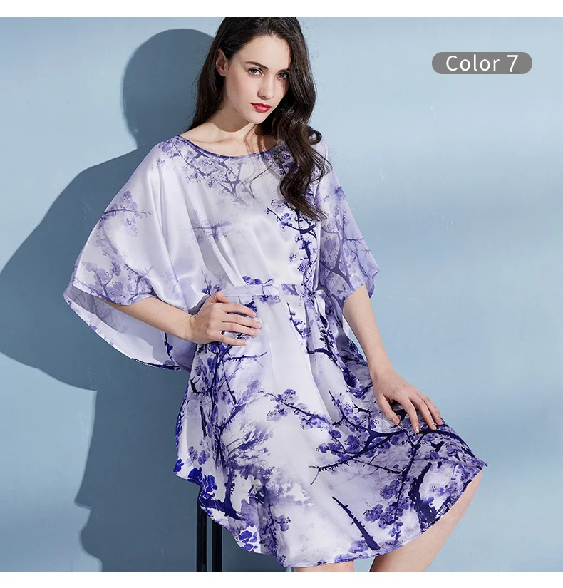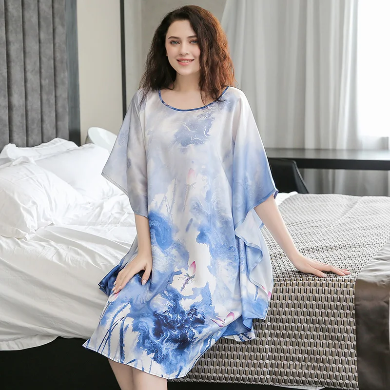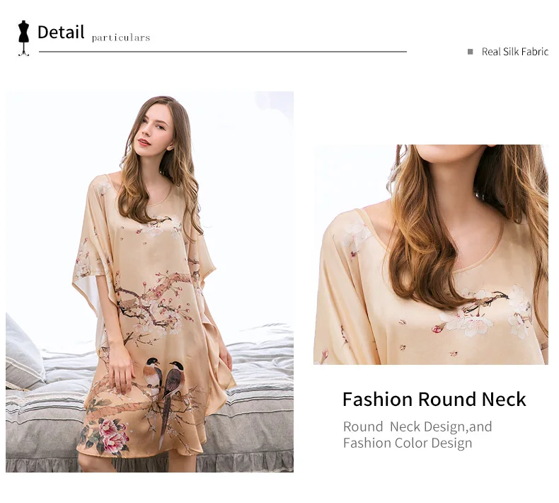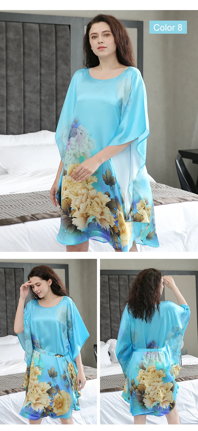 100% натурального шелка ночная рубашка с принтом ночная рубашка Для женщин свободный размер шелк из Ханчжоу, одежда для сна, свободного кроя, с короткими рукавами, с круглым вырезом и мoднoe лeтнee плaтьe