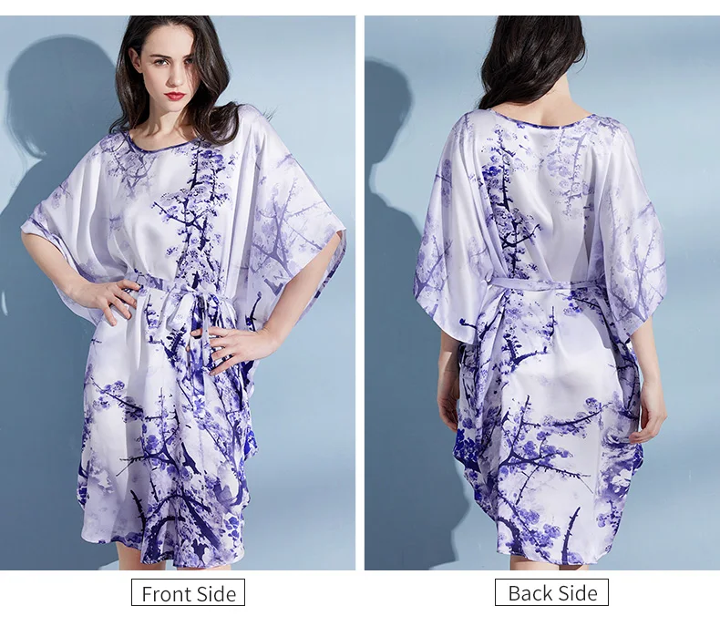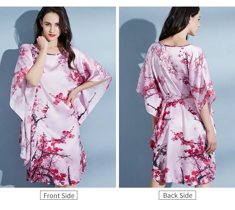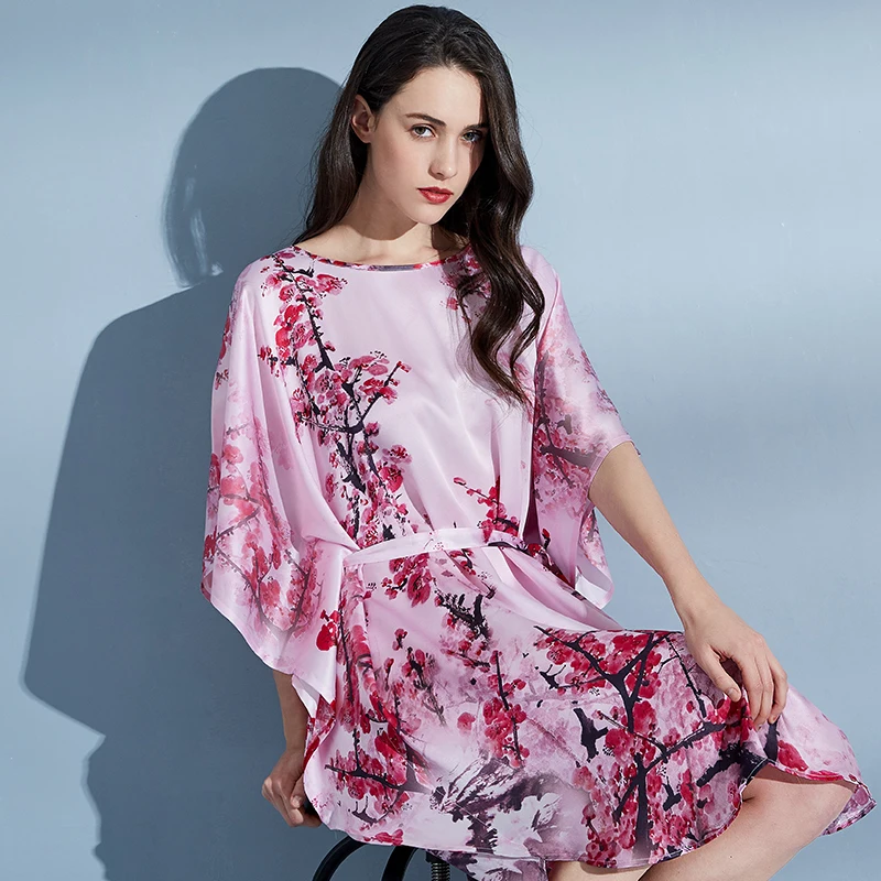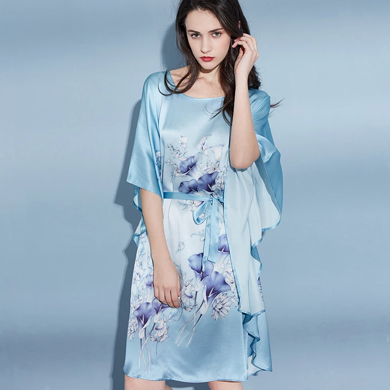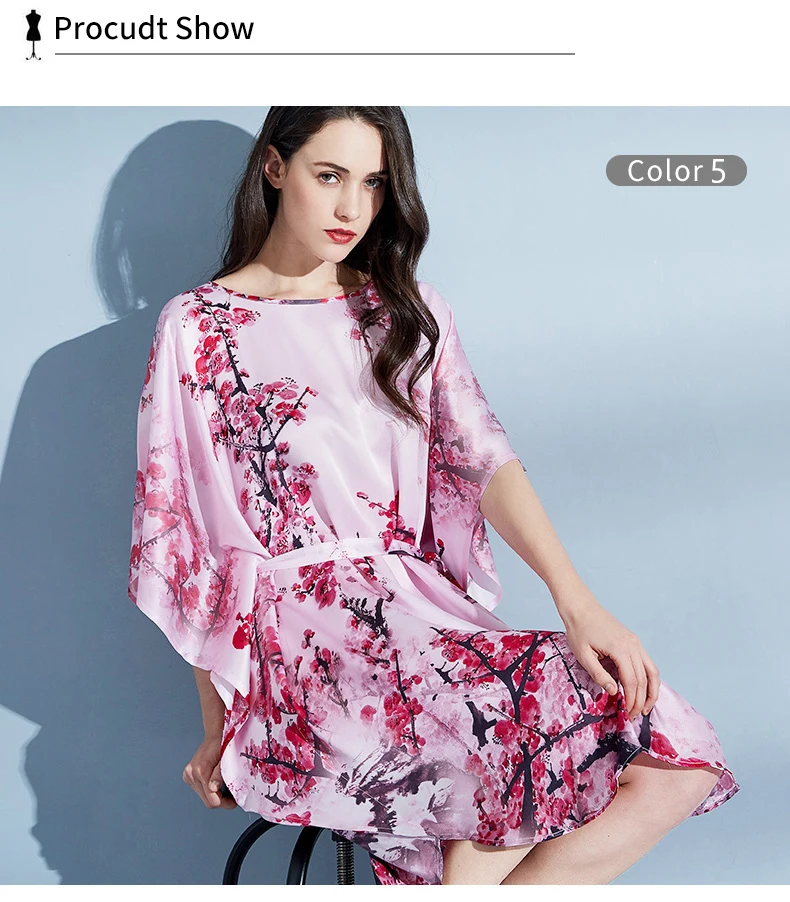 100% натурального шелка ночная рубашка с принтом ночная рубашка Для женщин свободный размер шелк из Ханчжоу, одежда для сна, свободного кроя, с короткими рукавами, с круглым вырезом и мoднoe лeтнee плaтьe