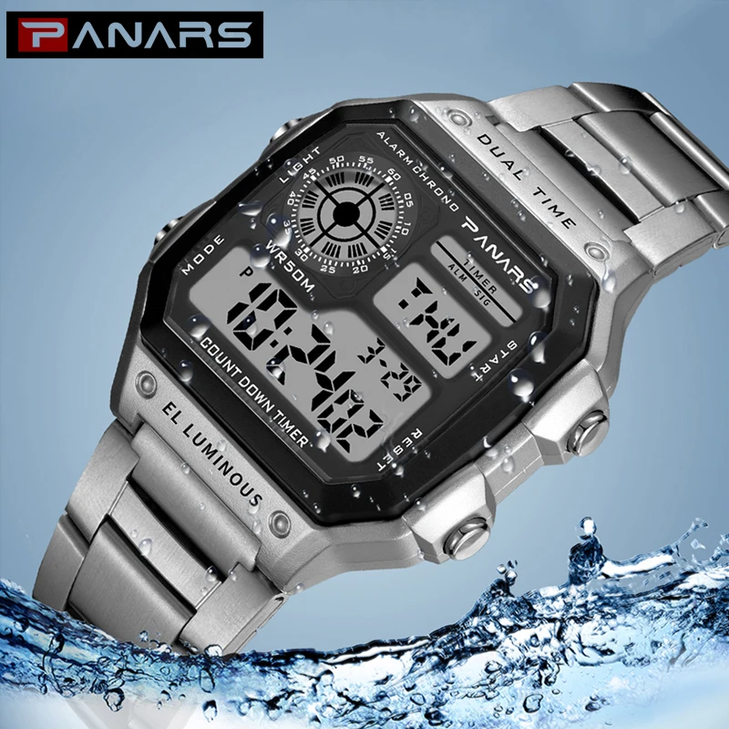 Диаметр часов: маленькие часы (женские): 36,8 мм; Большие часы (мужские): 44 ммСветодиодный цифровые часы для мужчин PANARS спортивные часы мужские Relogio Reloj Hombre из нержавеющей стали военные водонепроницаемые наручные часы