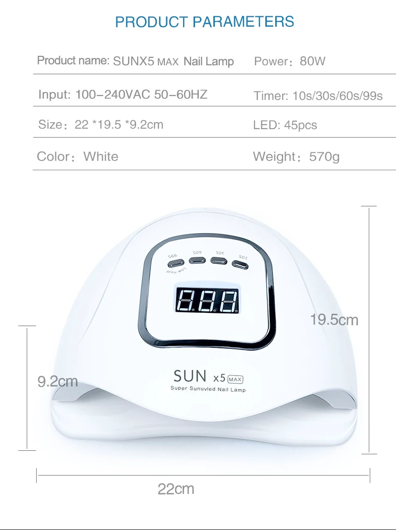 Этот продукт поможет вам высушить гели для ногтей. Он имеет 10s, 30s и 60s,99 кнопок для настройки времени и низкого теплового режима можно выбрать. Отсчет и хронометраж делает его удобным для наблюдения за временем сушки.