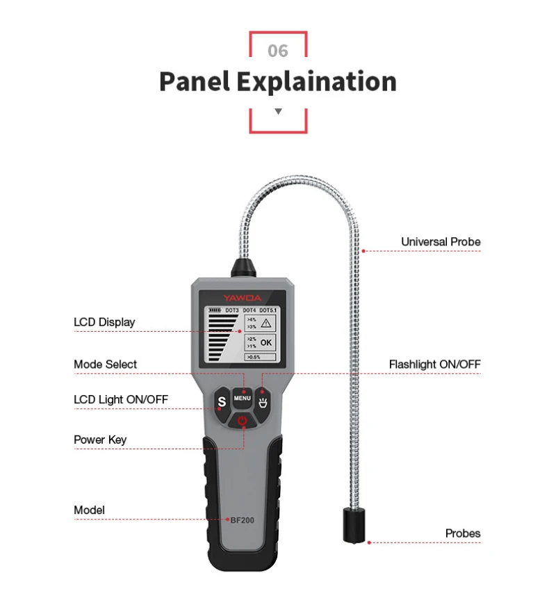 BF200 тестер тормозной жидкости: BF200-это ручной осмотр автомобиля, который определяет, необходимо ли заменить тормозной oll путем определения содержания воды в тормозном fuid. Его можно использовать для обнаружения тормозов oll DOT3, DOT4, DOT5.1, и пользователь может использовать его в соответствии с его собственными потребностями в тестировании