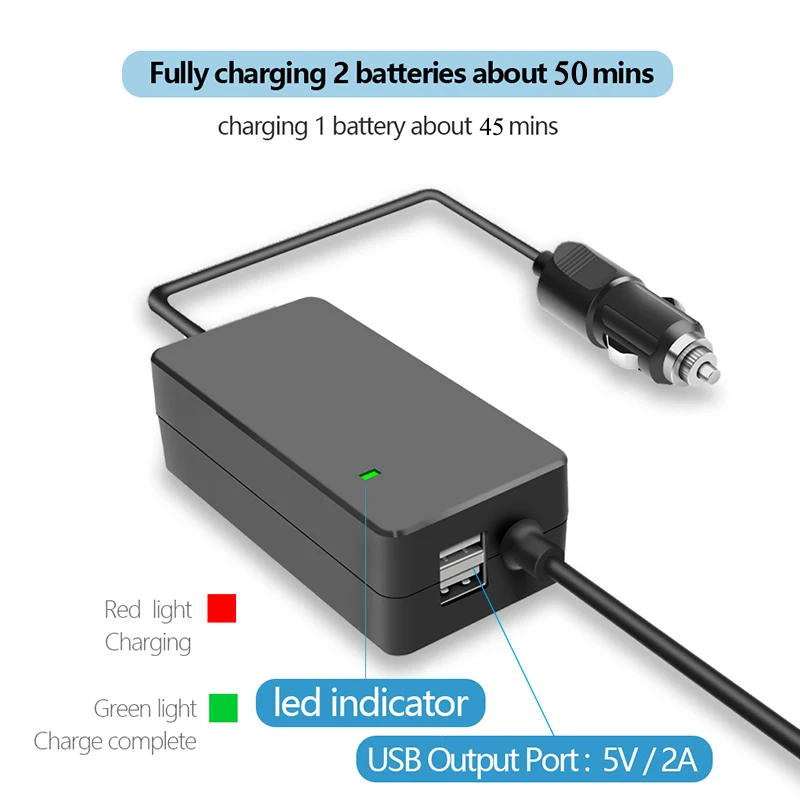 Название продукта: двойное электрическое автомобильное зарядное устройство для DJI Mavic Air Совместимость: DJI Mavic Air drone аккумулятор и пульт дистанционного управления Цвет: черный Входное напряжение: 12-14 В/10 А (макс.) Выходное напряжение батареи: 13,2 В/3.2A * 2 С одним выходом напряжения: 13,2 V/3.8A Выход USB: 5 В/2 А Время зарядки 1: около 45 минут (аккумулятор) Время зарядки 2: около 50 минут (2 батареи) Вес изделия: 183 г Посылка Вес: 239 грамм Размер упаковки: 16,9*11,6*4,3 см