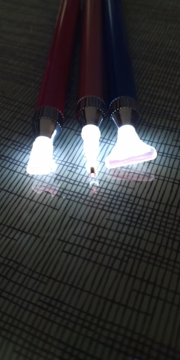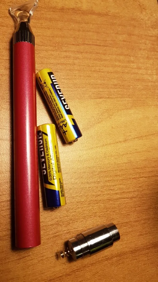 Пришёл заказ за 2 недели в СПб. Ручка очень хорошая, светит отлично. Очень хорошо вставляется по несколько штук, ровненько. Всем довольна. Только надо вставить 2 батарейки мизинчики.
