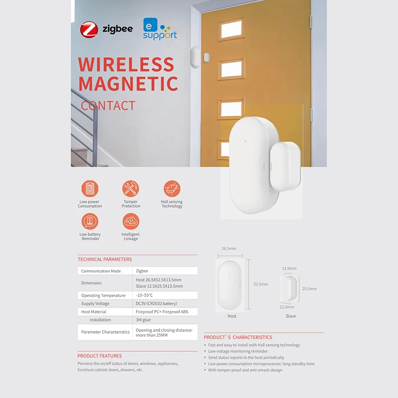 Примечание:Продукт должен использоваться с шлюзом ewelink zigbee и не может использоваться отдельно.Особенности:1. Изысканный и модный внешний вид, легко вписывается в различные среды.2. Поддержка дизайна DIY, различных сцен.3. Интеллектуальная связь, установка без инструментов.4. Анти-демонтажная конструкция в профессиональной области безопасности.5. С контролем низкого напряжения и оперативной функцией.6. Беспроводная передача сигналов данных.7. Ультра-низкое энергопотребление, длительный срок службы батареи.8. Регулярно отправляйте онлайн-отчеты хосту.Спецификация:Вход питания: 3 В постоянного тока (аккумулятор CR2032)Рабочая tamperature: -10 ℃ ~ 55 ℃Рабочая влажность: 10% ~ 90% относительной влажностиМетод подключения: Zigbee 802.15.4Срок службы батареи: 1 годМатериал: PC + ABSОперационная система: IOS8.0/Android4.0 и выше