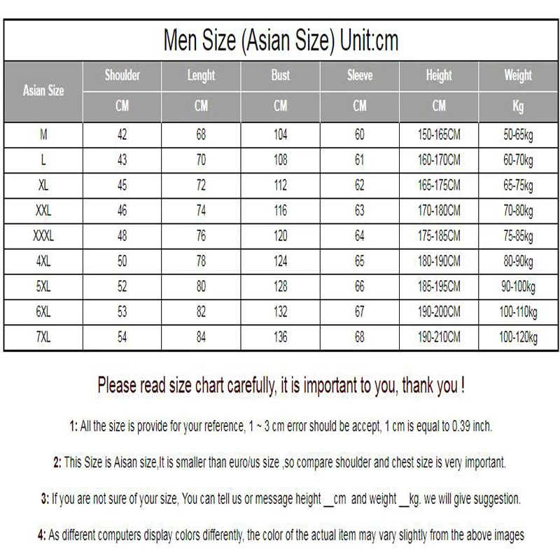 Мужской размер (Азиатский размер) Единица измерения: см Азиатский размер Сумка на плечо Длина Обхват груди Рукава Высота Вес См См См См См Кг М 42 68 104 60 150-165 см В переменного тока, 50-65 кг L 43 70 108 61 160-170 см 60-70 кг XL 45 72 112 62 165-175 см 65-75 кг XXL 46 74 116 63 170-180 см 70-80 кг XХХL 48 76 120 64 ГБ 175-185 см 75-85 кг 4XL 50 78 124 65 180-190 см 80-90 кг 5XL 52 80 128 66 185-195 см 90-100 кг 6XL 53 82 132 67 190-200 см 100-110 кг 7XL 54 84 136 68 190-210 см 100-120 кгПожалуйста, внимательно прочитайте таблицу размеров, это важно для вас, спасибо!