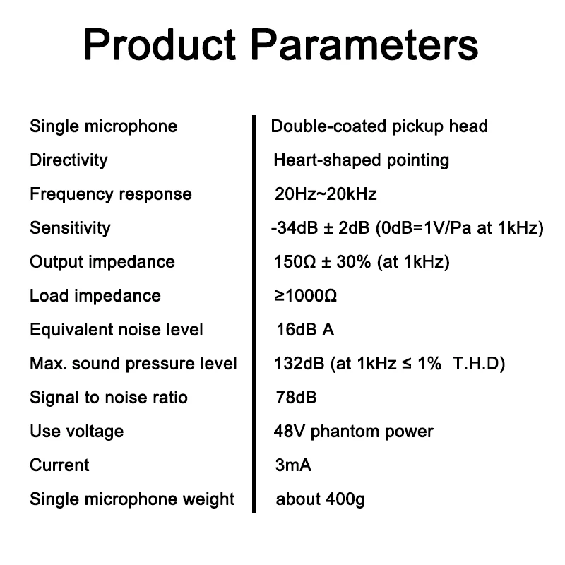 Один микрофон: головка пикапа с двойным покрытиемНаправленность: направленность в форме сердцаЧастотная характеристика: 20 Гц-20 кГцЧувствительность: -34 ± 2 дБ (0 дБ = 1 В/Па при 1 кГц)Выходное сопротивление: 150 Ом ± 30% (при 1 кГц)Сопротивление нагрузки: ≥ 1000 ΩЭквивалентный уровень шума: 16 дБ AМакс. Уровень звукового давления: 132дб (при 1 кГц ≤ 1% T. H.d)Отношение сигнал-шум: 78 дБРабочее напряжение: 48 В фантомная мощностьТок: 3 мАКабель Длина: около 2,5 м