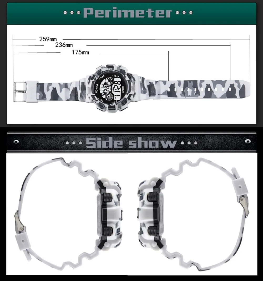Длина ремешка: 25,9 см (включая застежку)Ширина ремешка: 3,0 смДиаметр циферблата: 5,0 смТолщина циферблата: 1,7 смМатериал ремешка: силиконТип застежки: ПряжкаВес посылка: 55 гПосылка1 часы(Водонепроницаемость) можно только брызгать немного воды, нельзя мыть или купаться, плавать, нырять.
