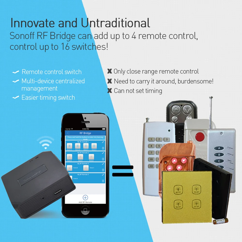 1. Преобразуйте Радиочастотный пульт 433 МГц в приложение через Wi-Fi 2. Сделайте удаленное приложение для радиочастотных устройств 433 МГц Управляемый 3. Поддержка добавления макс. 16 433 МГц RF Удаленный/переключатель штор/сигнализация 4. Поддержка управления до 64 433 МГц RF Устройства 5. Поддержка всего 8 расписаний/обратного отсчета/цикла Таймеры для включения/выключения 433 МГц с радиочастотным управлением Устройства 6. Получение push-сообщения от 433 МГц Датчик PIR, датчик двери и окна сигнализации 7. Управляйте радиочастотными устройствами 433 МГц через Wi-Fi или мобильную сеть 8. Бесплатное мобильное приложение eWeLink для iOS и Android Отлично работает с Amazon Alexa, Google Assistant