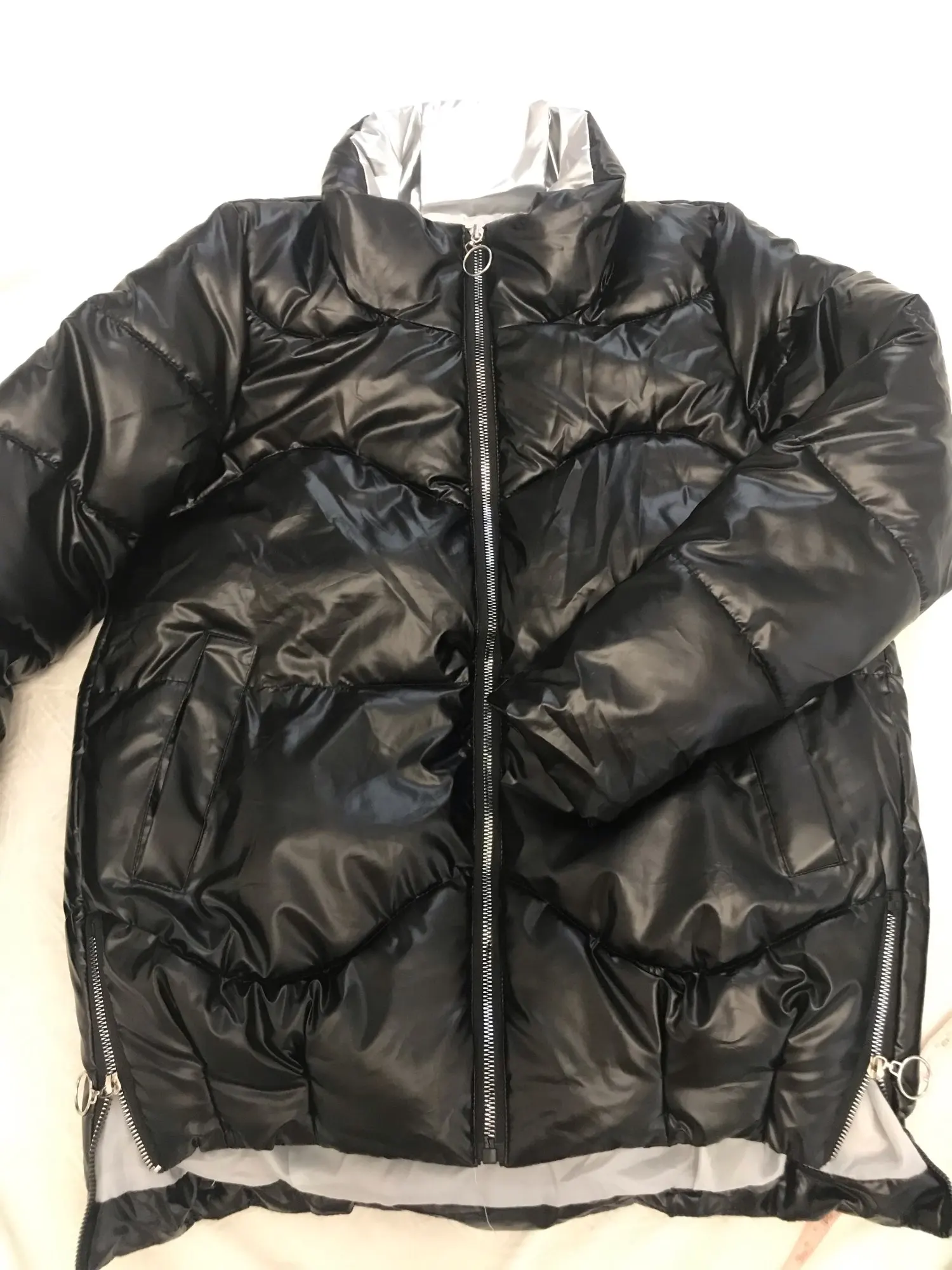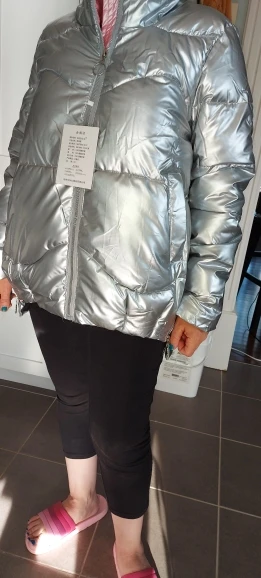 Продавец пишет что товар на 2 размера меньше, но он оказался мне большой. У меня 46 размер, на всякий случай заказала по схеме 48-50 (2х) куртка оказалась очень большой. Если бы взяла свой размер, то было в пору. Пришлось куртку отдать в ателье, к тому же на воротнике с внутренней стороны были как дырки от иголок, как будто протыкали много раз. Но в целом куртка тёплая, можно и в - 15 носить. Выглядит как на фото, стильно и так же блестит.