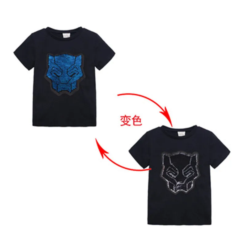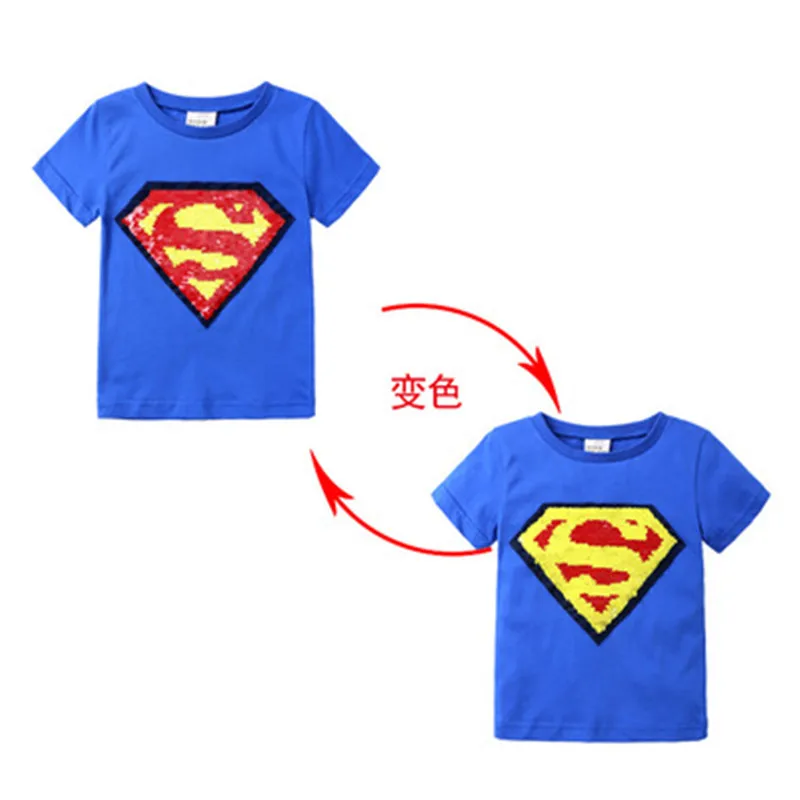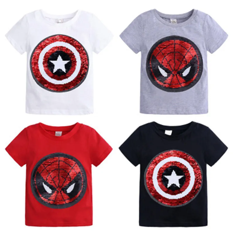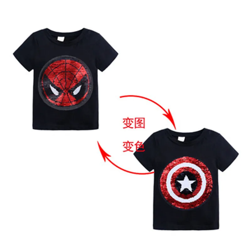 Летняя футболка для мальчиков, двусторонние топы с блестками супергероев, Детская футболка с изображением Человека-паука, меняющая лицо Футболка Капитана Америка, детская одежда