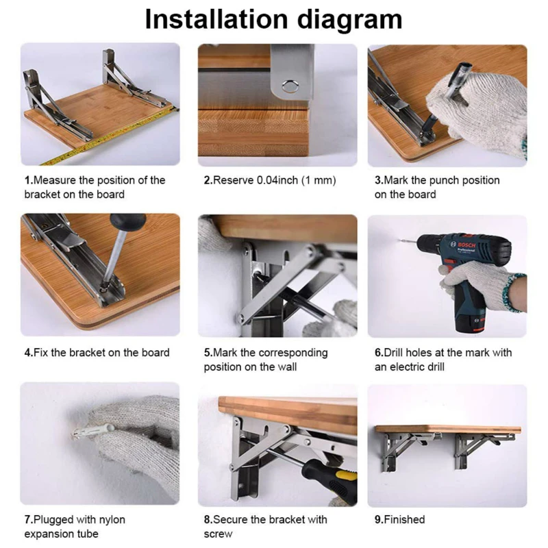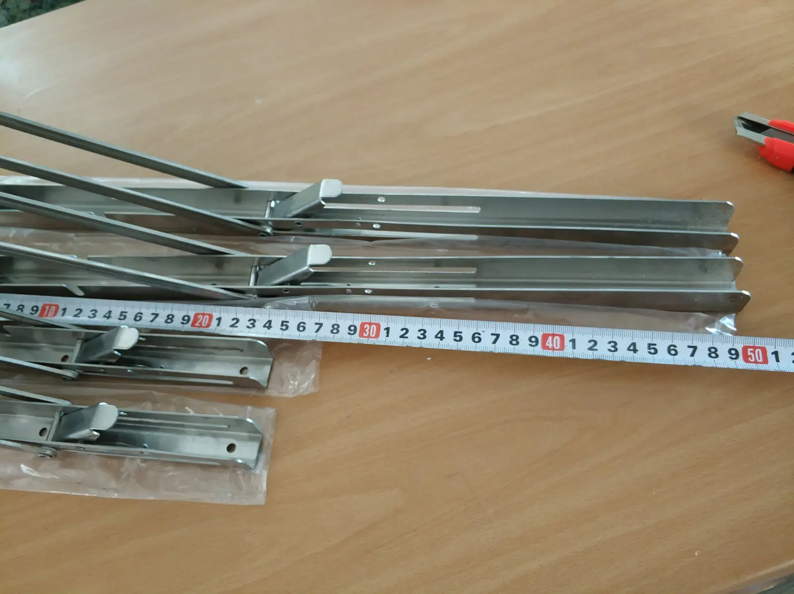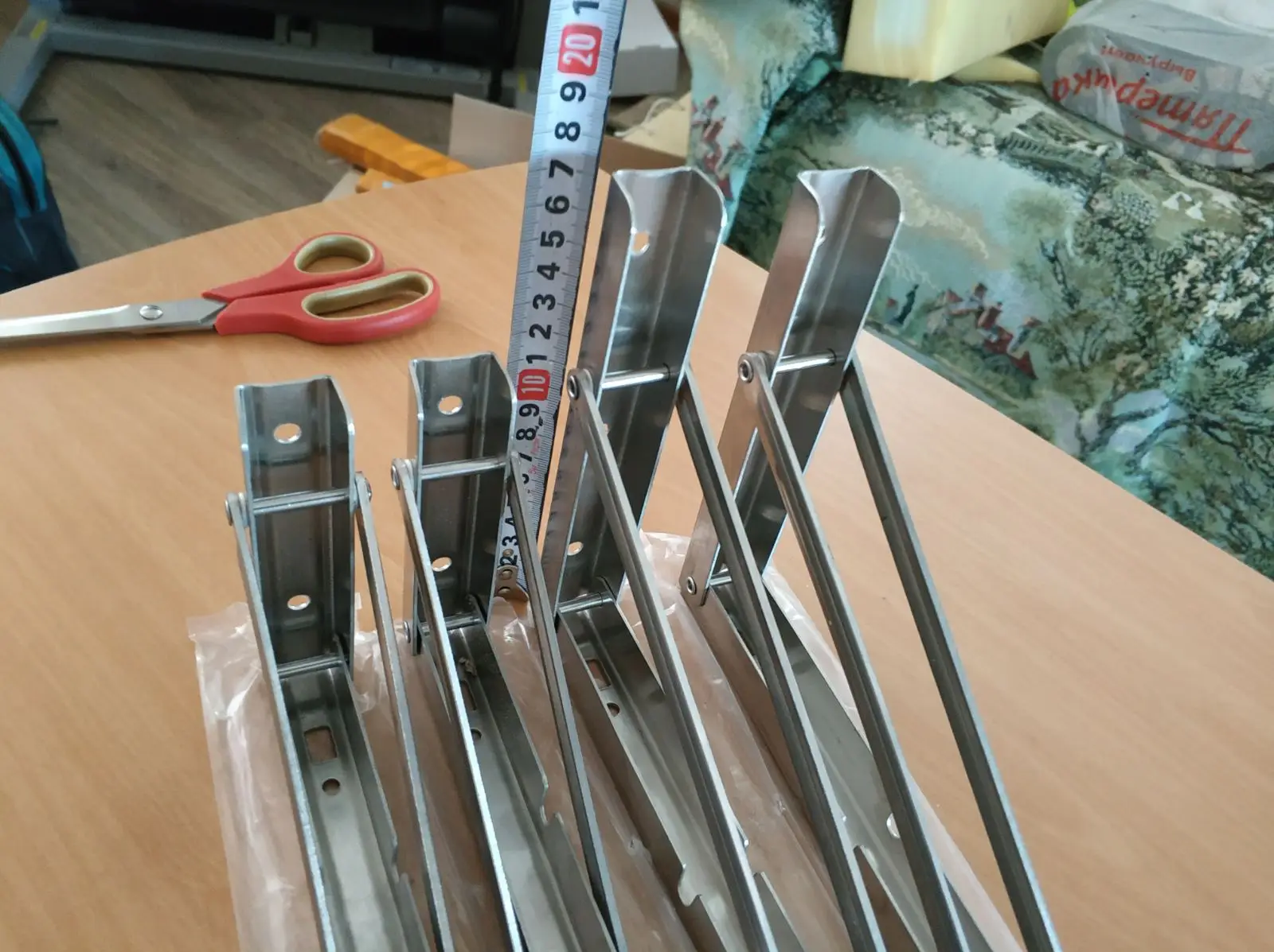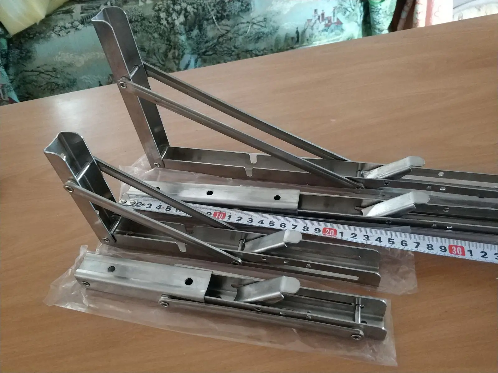 Кронштейны - штамповка из рубленого листа нержавейки 1 мм. Кромка чучь обработана. Заусенцев нет. Руки не обрежешь. Клепки из простой стали. Немного люфтит так как складывается. Крепкий, добротный. Взял "10" под небольшой столик для мамы. Смело берите. Давно искал что-то подобное на маленькую кухню.