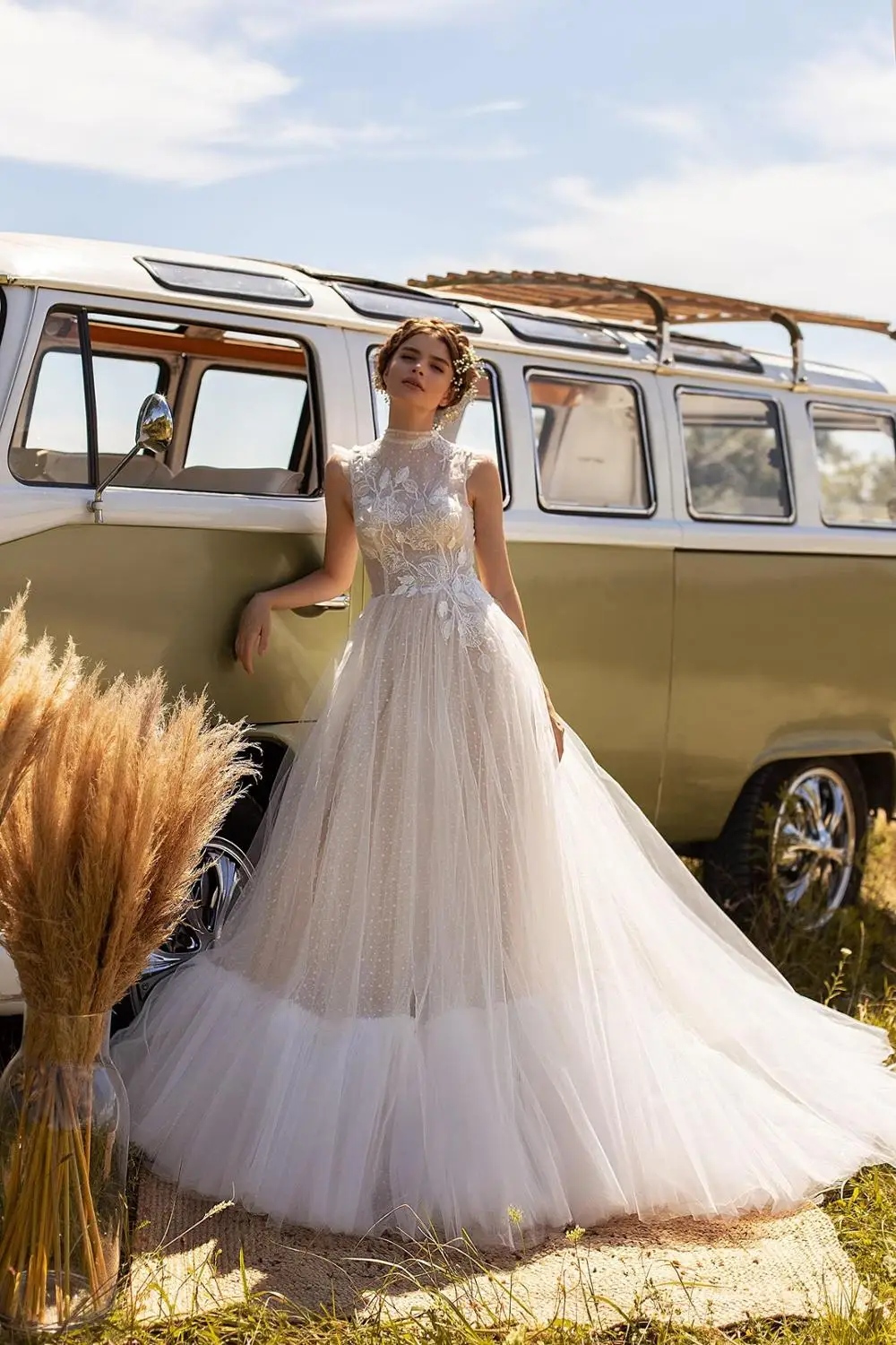 Новинка 2021, свадебные платья, кружевные свадебные платья с круглым вырезом, аппликацией из бисера, на заказ, на пуговицах, с открытой спиной, со шлейфом, свадебное платье трапециевидной формы