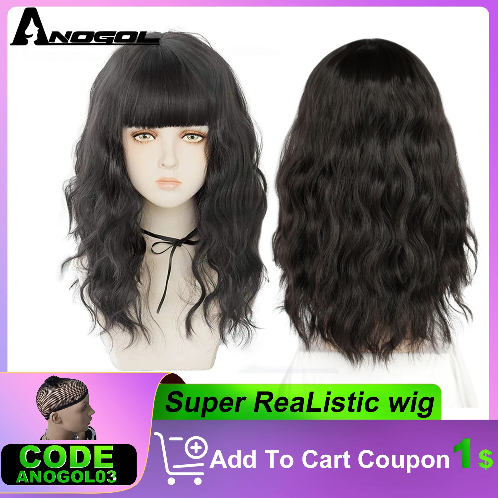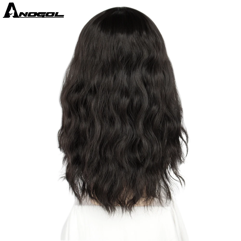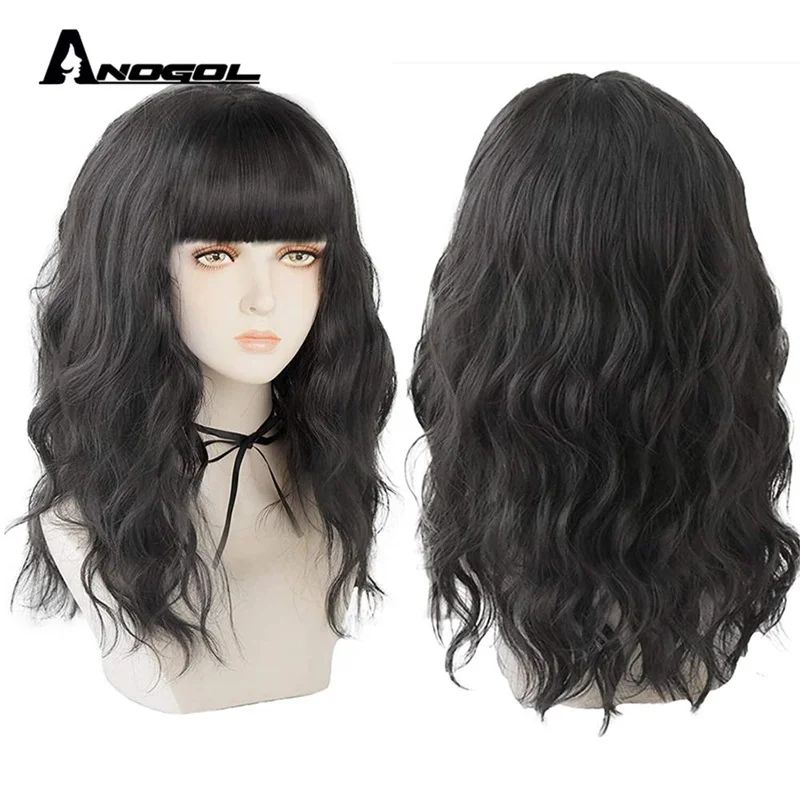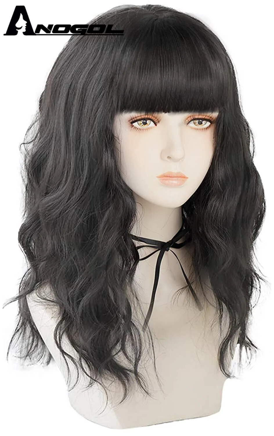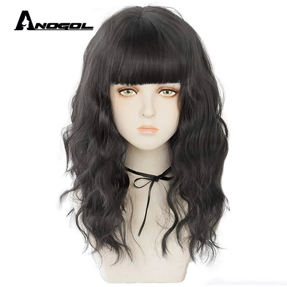 Парик из синтетического материала ANOGOL, черный парик с глубоким волнистым рисунком, с челкой для женщин, парик Лолиты, короткие волосы, многослойные, косплей, вечерние, синтетический парик
