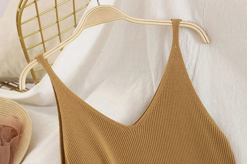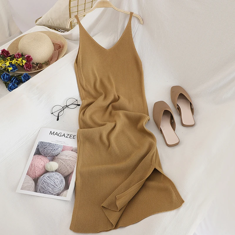 Женское трикотажное платье, однотонное, с разрезом, без рукавов, с V-образным вырезом, в Корейском стиле, W118